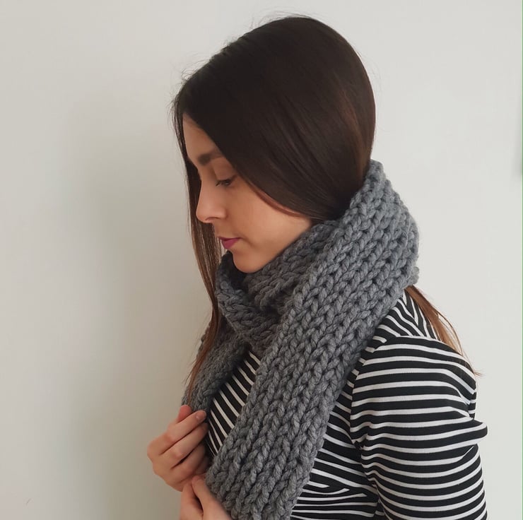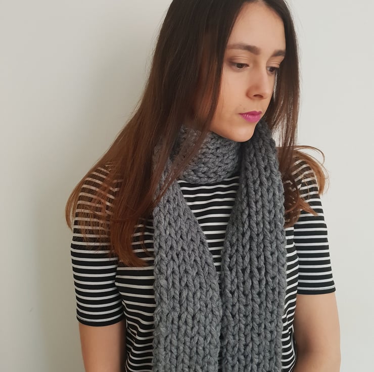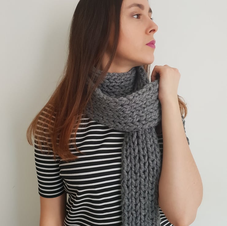 Women's Grey Chunky Knit Extra Soft Minimalist Statement Scarf For Sale.
