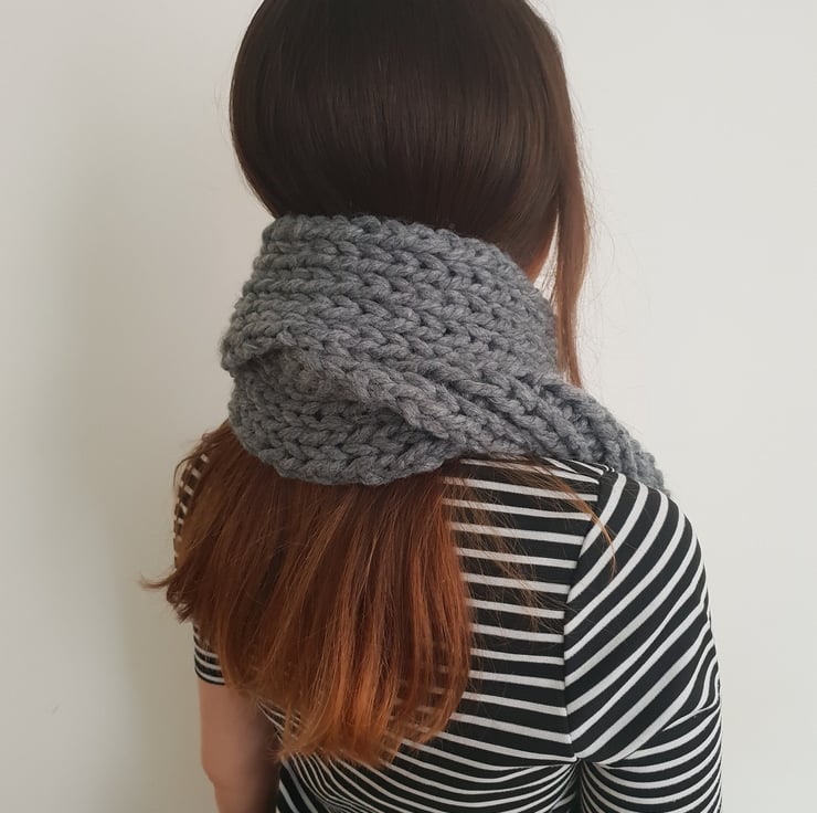 Created with soft chunky acrylic yarn in a fashionable rib stitch design in the colour grey.