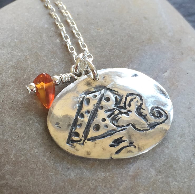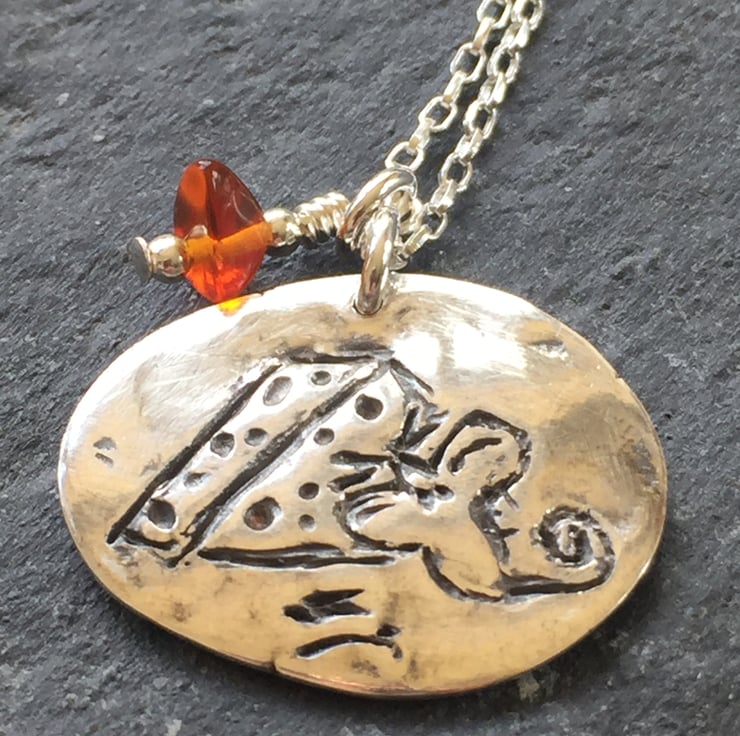 A fun mouse and cheese design with a little mouse viewing expectantly are large chunk of cheese. The pendant is handmade in fine silver. The pendant is hung on an 18 inch sterling silver chain with a sterling silver and 4mm amber semi precious stone charm.