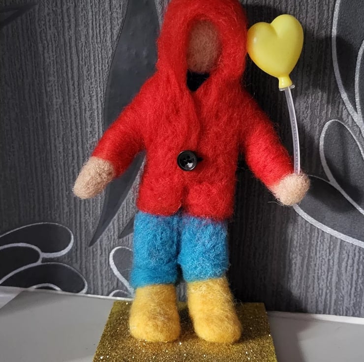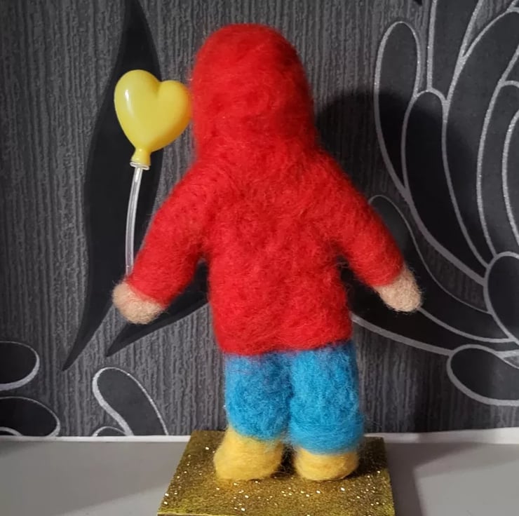 He is holding a heart shaped, yellow balloon and is standing on a glittering gold base.