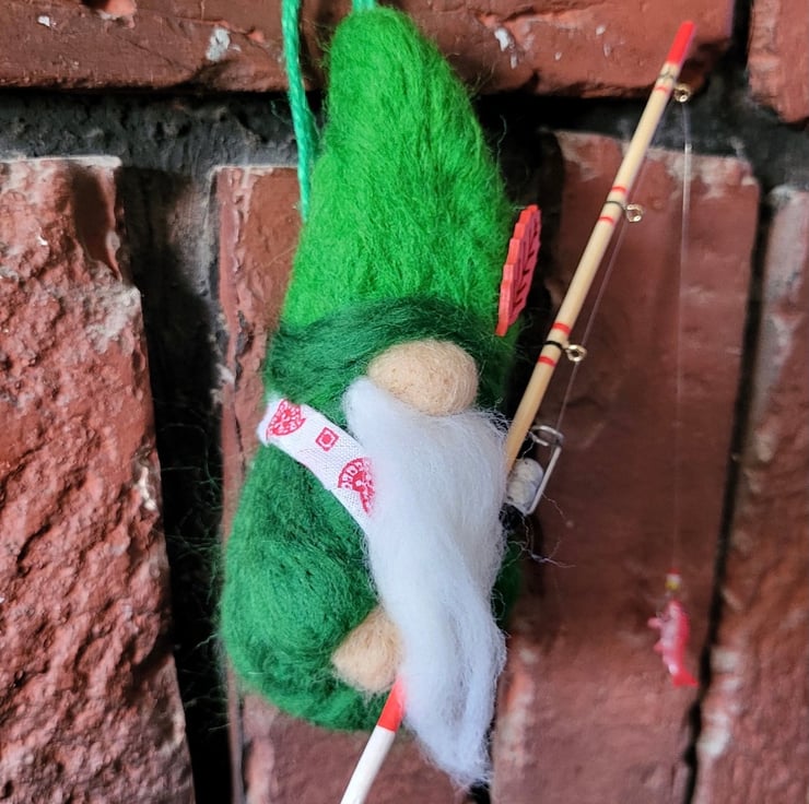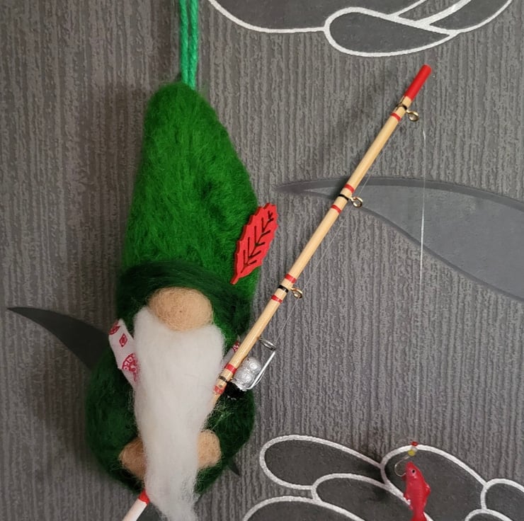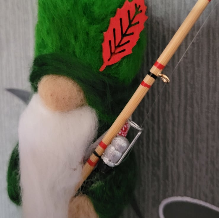 Gerald loves fishing, he is a super cute little fella with a long white beard, cotton scarf, little red, wooden leaf decorating his hat and best of all, he is carrying a real, miniature, wooden fishing rod with real, little line, hook, floats and a little red fish at the end of his line!