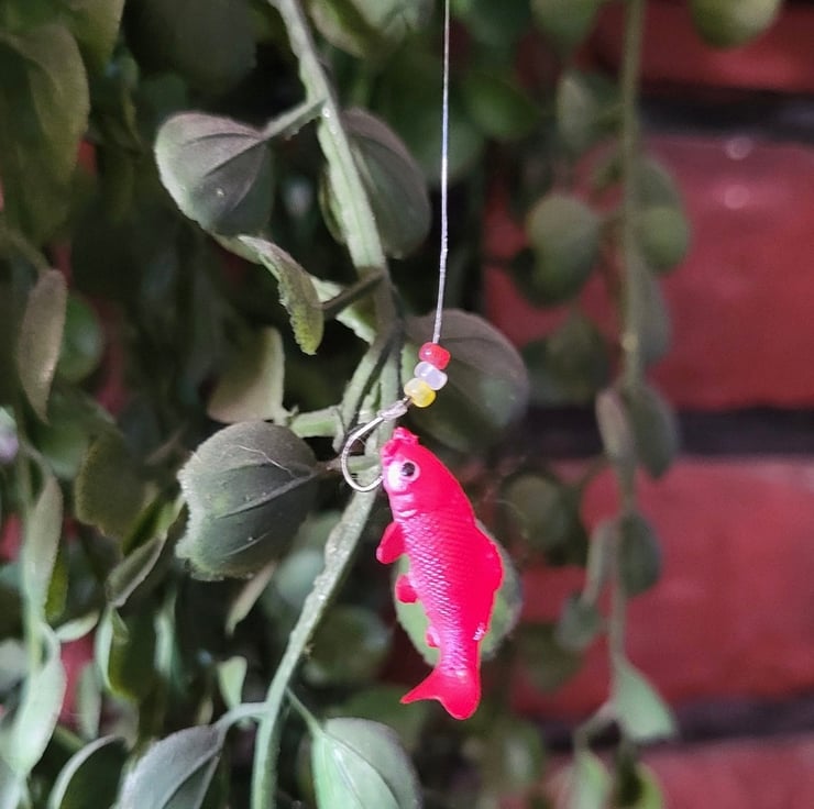 - Real, wooden fishing rod with metal rings and plastic line.