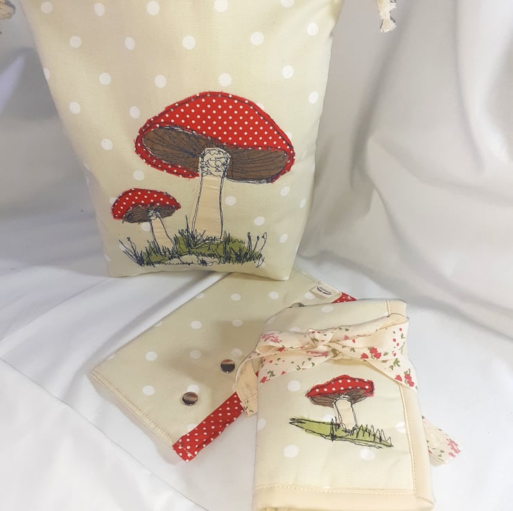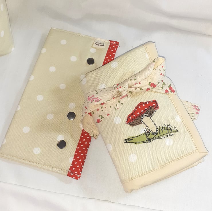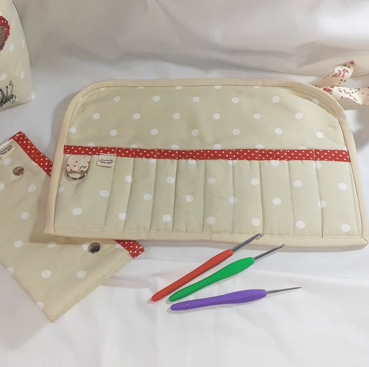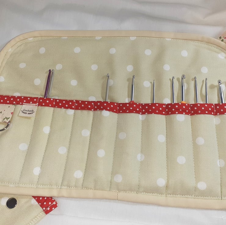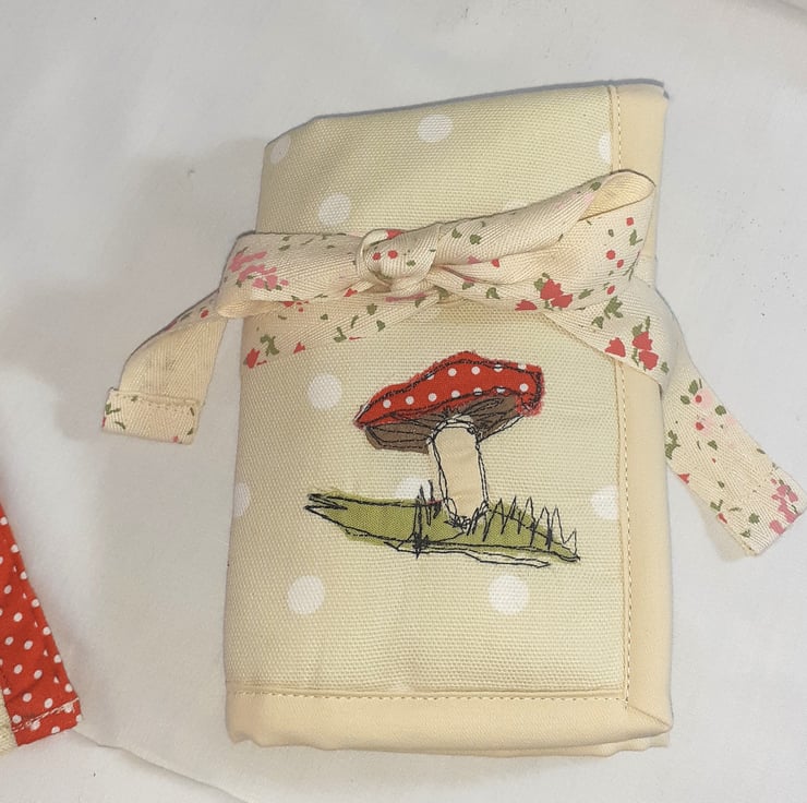 The Crochet Hook storage case exterior has a free motion stitched toadstool design, and has a wrap around tie fastening. The interior has 10 compartments to store crochet hooks or small double pointed needles and a ring for your stitch markers. The top folds down to cover the ends of the tools. It is fully lined and as soft interfacing.