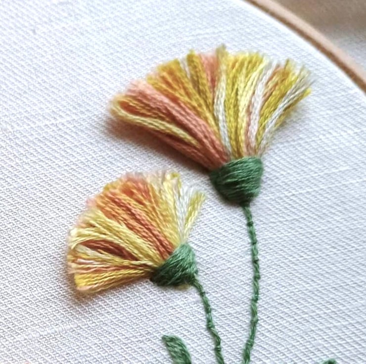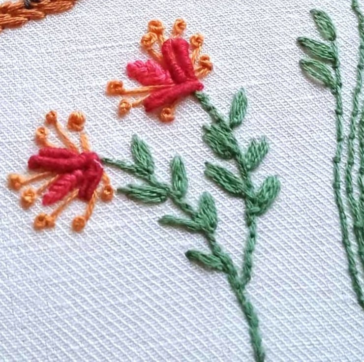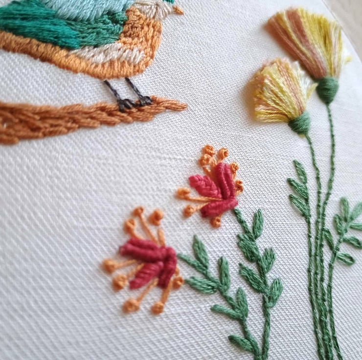 For the bird I used "long and short" stitch in blended colours to paint his head and body, and padded satin stitch to add depth to his wings. The red flowers include curved bullion knots with pistil stitches (elongated french knots), and the tassel flowers are a modern interpretaion of turkey stitch.