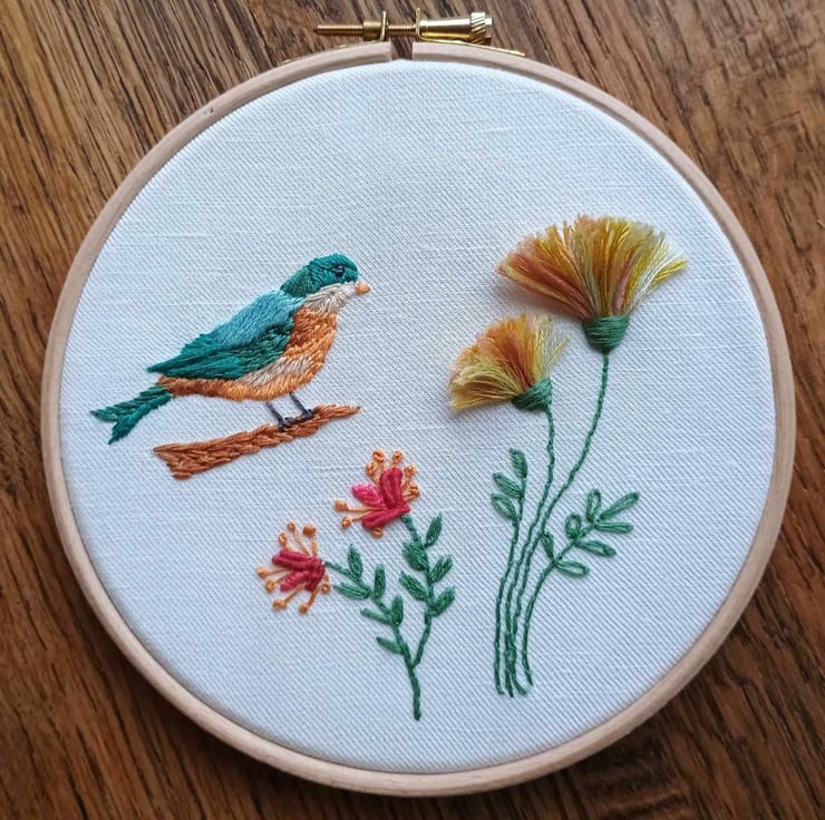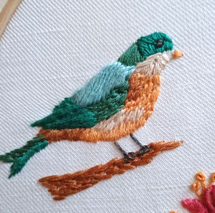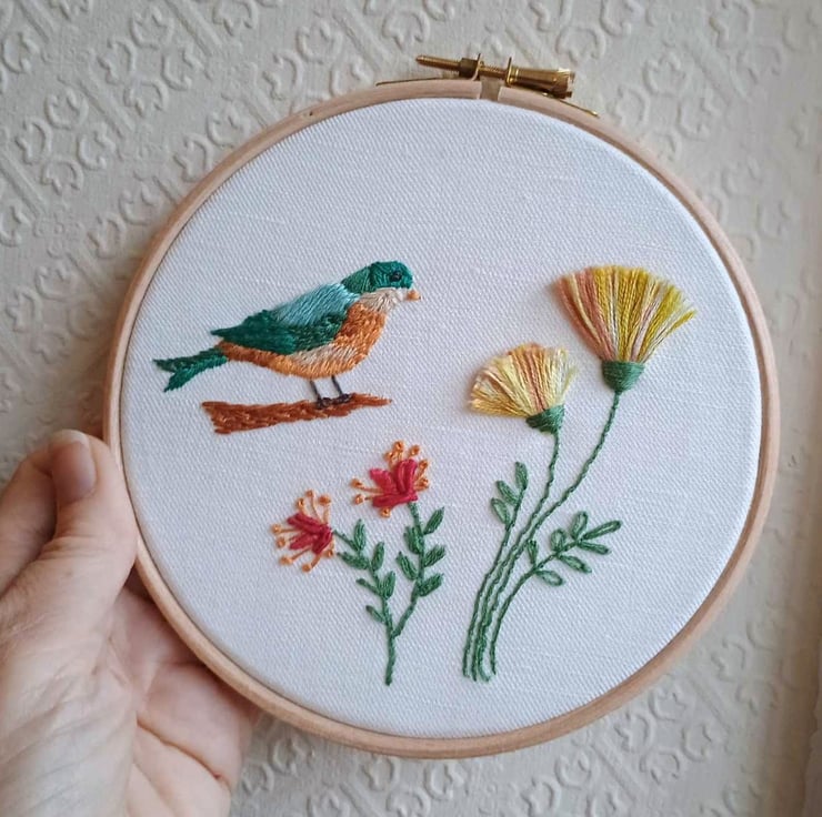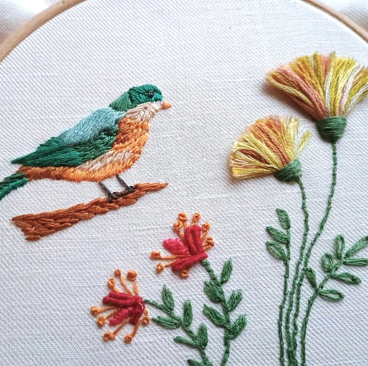 Hand stitched by me in cotton embroidery threads on an Irish linen fabric background and mounted in a quality beechwood hoop frame, Bird with Flowers would be lovely gift for birthdays or Mothers Day, or a unique piece of art for your own home.