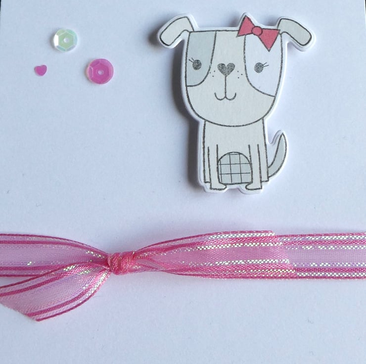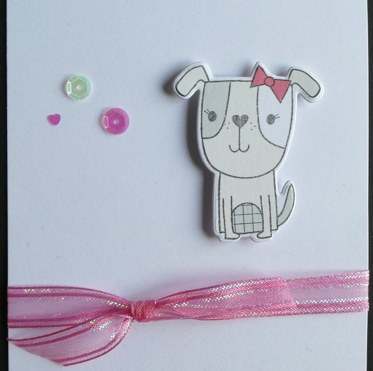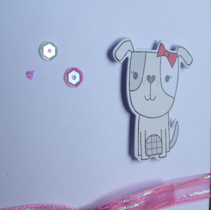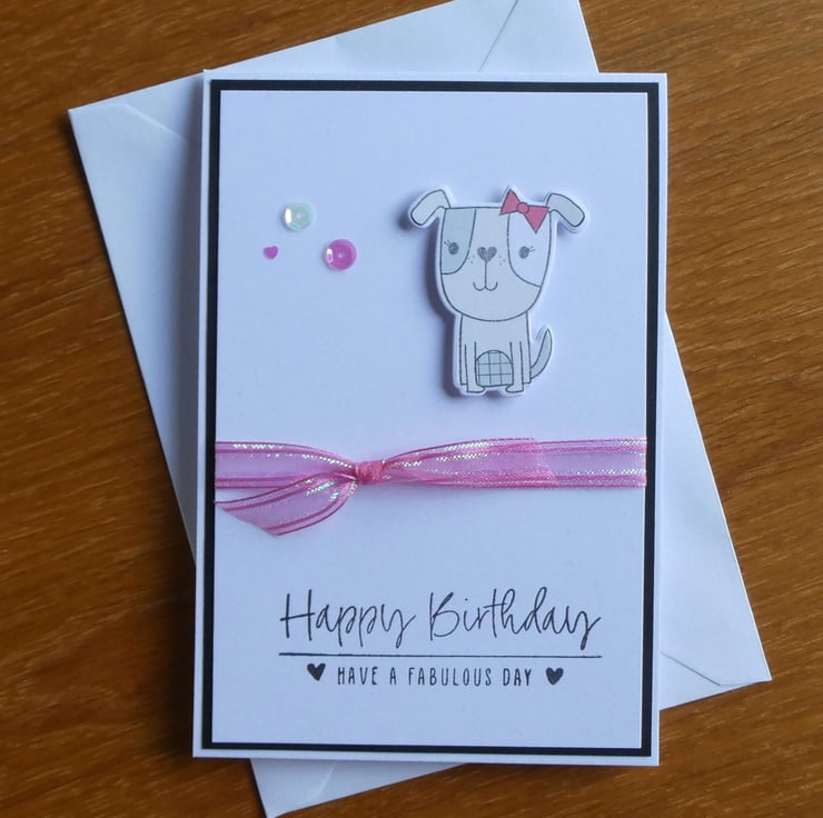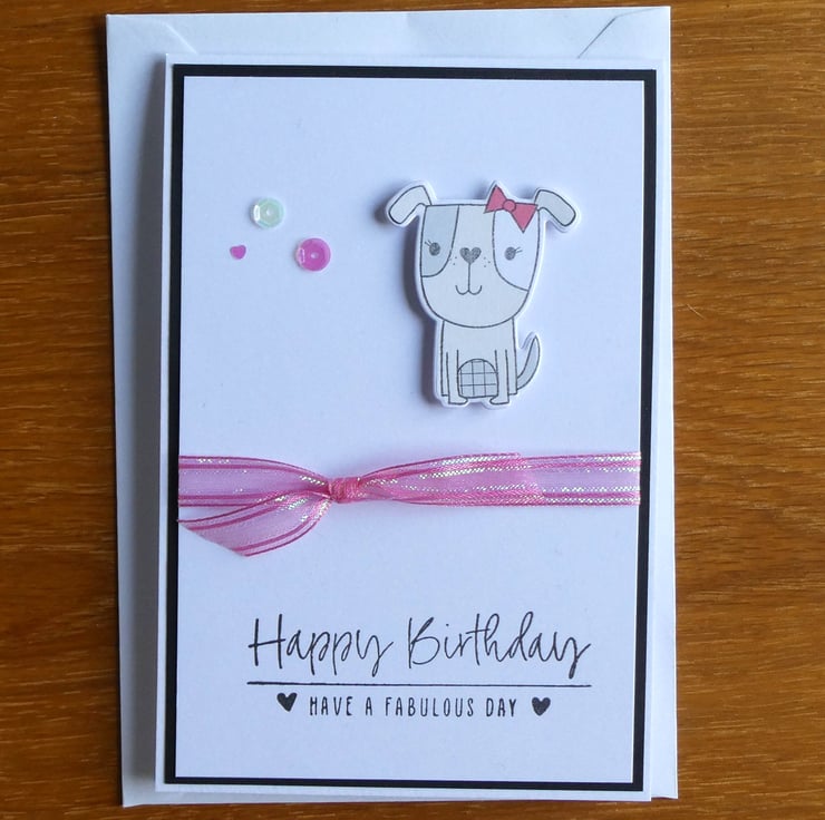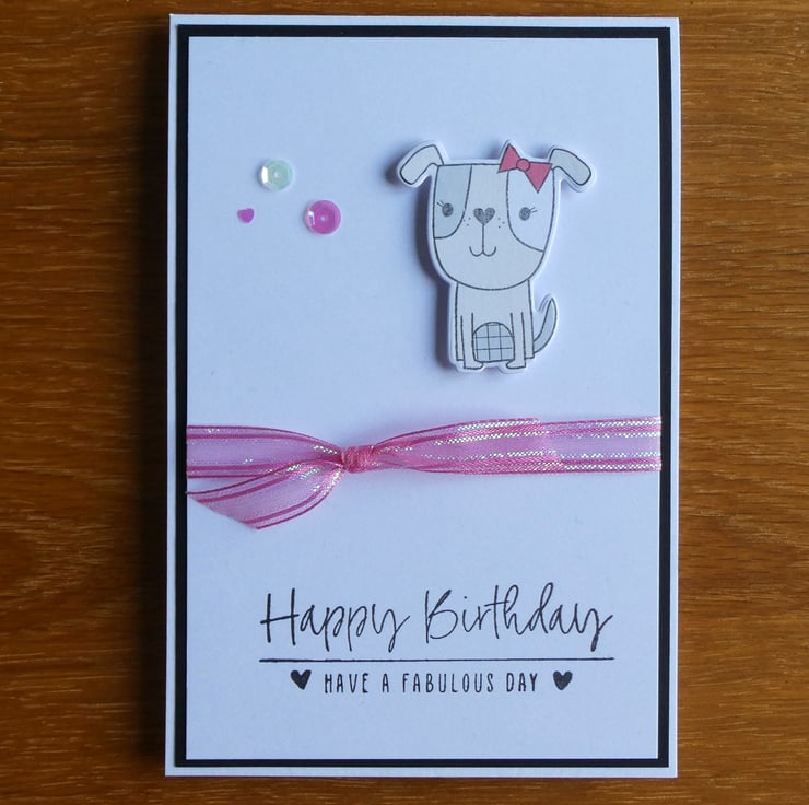 The dog has been hand stamped and inked in shades of pink and grey and then die cut and fixed with foam pads to raise it slightly from the background. Three sequins in a mixture of holographic and shades of pink have been added and the greeting Happy Birthday have a fabulous day has been stamped in black archival ink.