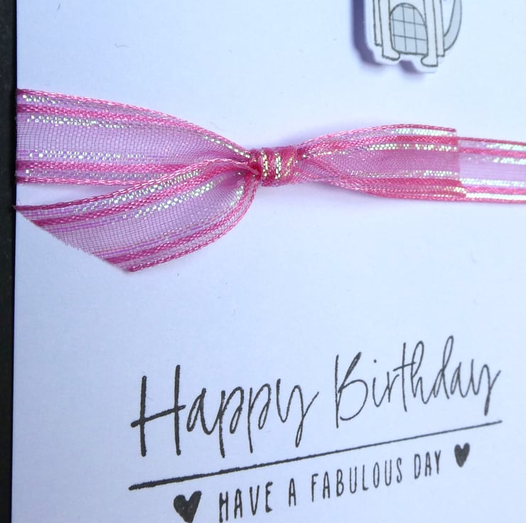 The card has been wrapped with a shimmering pink and holographic organza ribbon tied in a knot to finish the design.