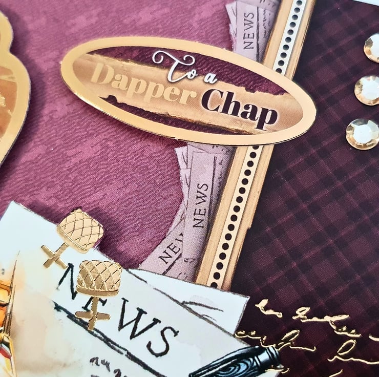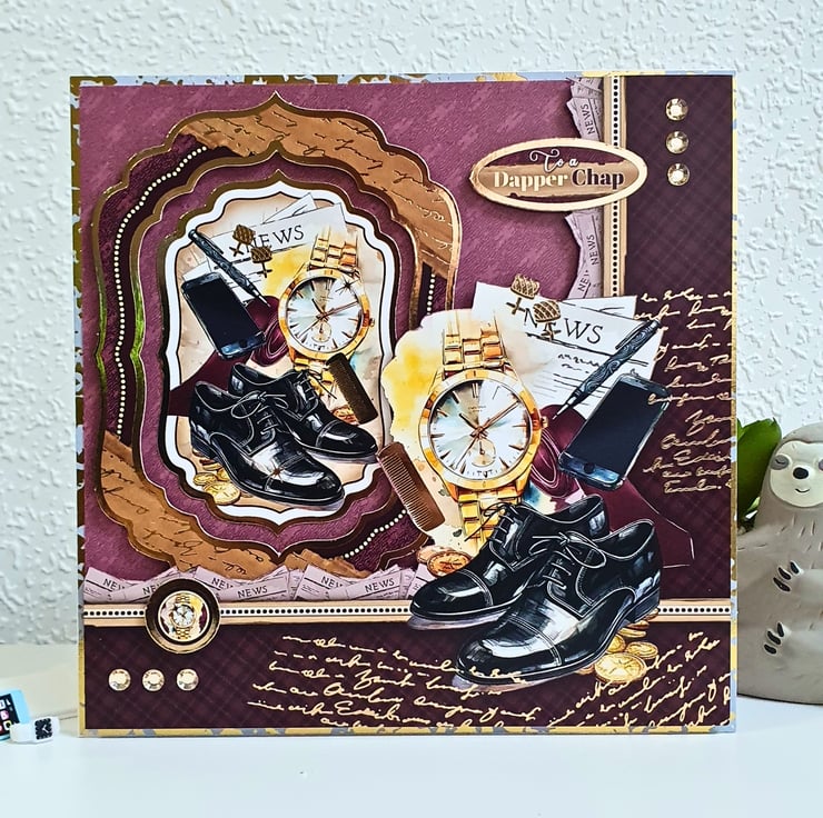 It consists of white card base layered with gold paper & gold foiled cardstock in mauve & brown. The main topper lays on the left side of the card, while on the right side there is a decorative, fussy-cut panel with gingham pattern. They both display an image of men's accessories. A gold watch, shiny shoes, gold cufflinks, a pen, a mobile phone, a comb, a newspaper, a tie... Everything a dapper chap needs! The sentiment "To a Dapper Chap" lays on the top right corner of the card. It is finished with gold diamante. Inside, the coordinating double insert lays on the same gold frame as the front & displays the message "Happy Birthday" stamped in brown.