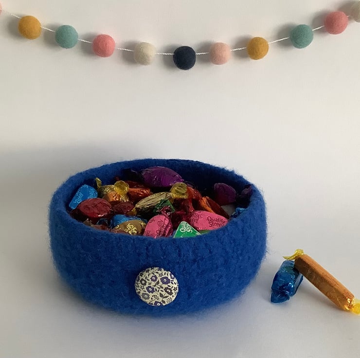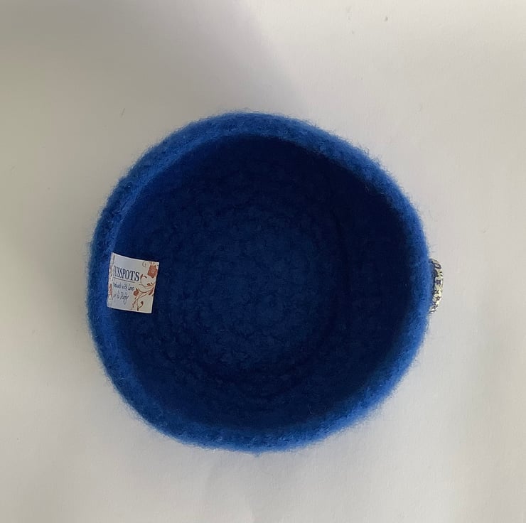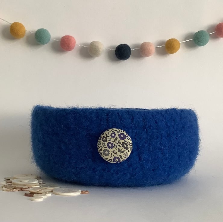 FELTED 'FUSSPOT' BOWL, desk tidy Cobalt. Blue. (with Liberty fabric button).