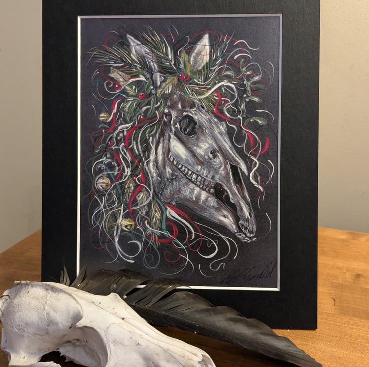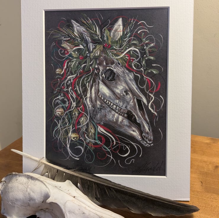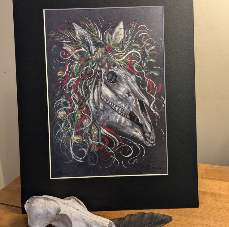 An open edition signed high quality print of an original drawing of the Mari Lwyd. The original art work is mixed media. I used artists quality coloured pencils and pastels. Each print is professionally mounted in a textured white or black mount. It will be wrapped in cellophane and tissue and posted in a sturdy box.