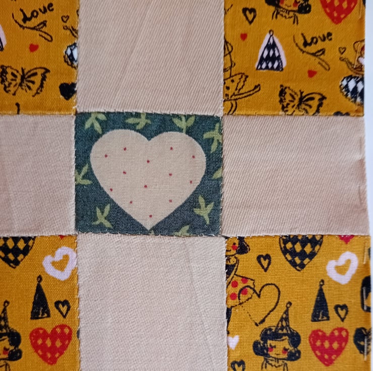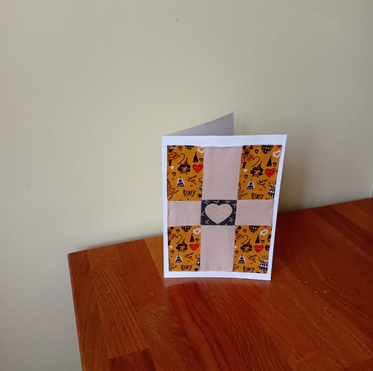 The front is a patchwork medley of three fabrics. This is hand sewn on to the card.