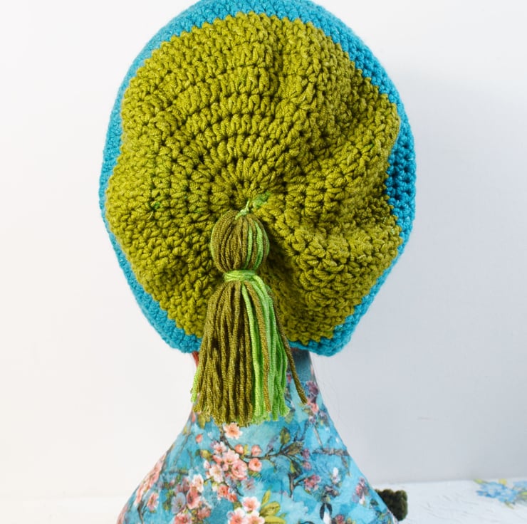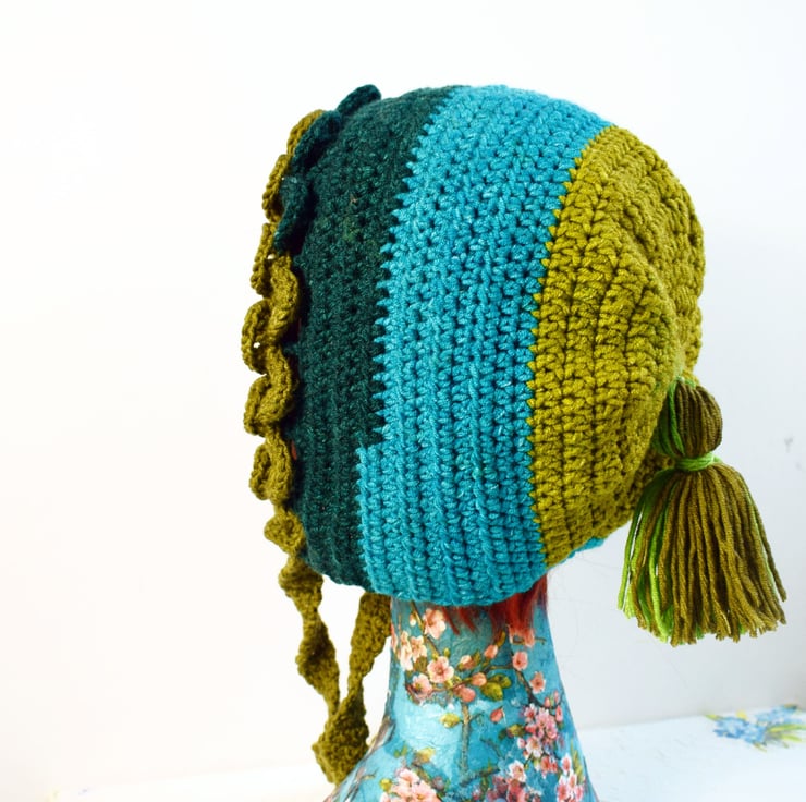 It starts at the back in an olive green which transitions through a turquoise blue to a deep fir green and then finishes with a khaki green. The front has a couple of rows of dragonscale and the back is finished with a little tassel. This hat has ties so if it's windy you can tie them up or leave them loose if you prefer.