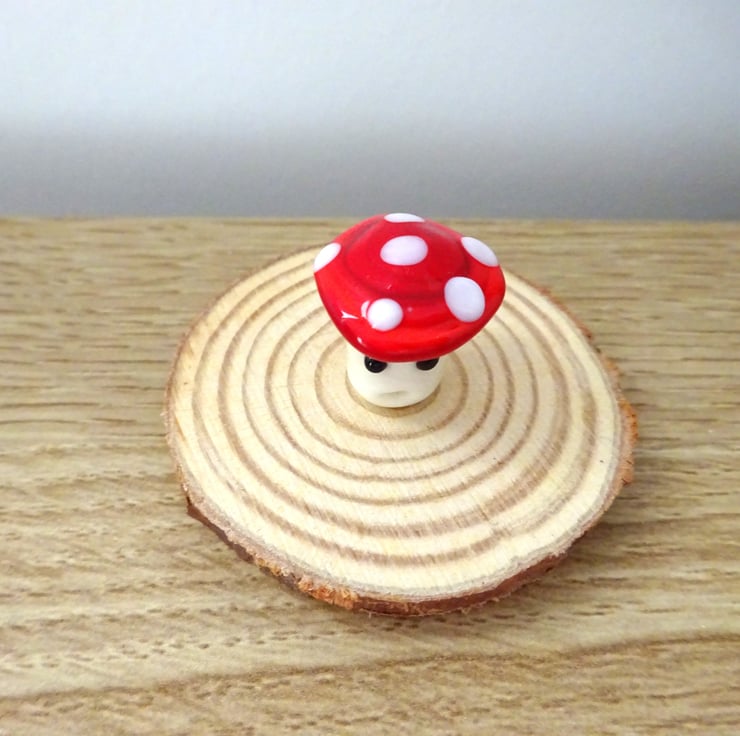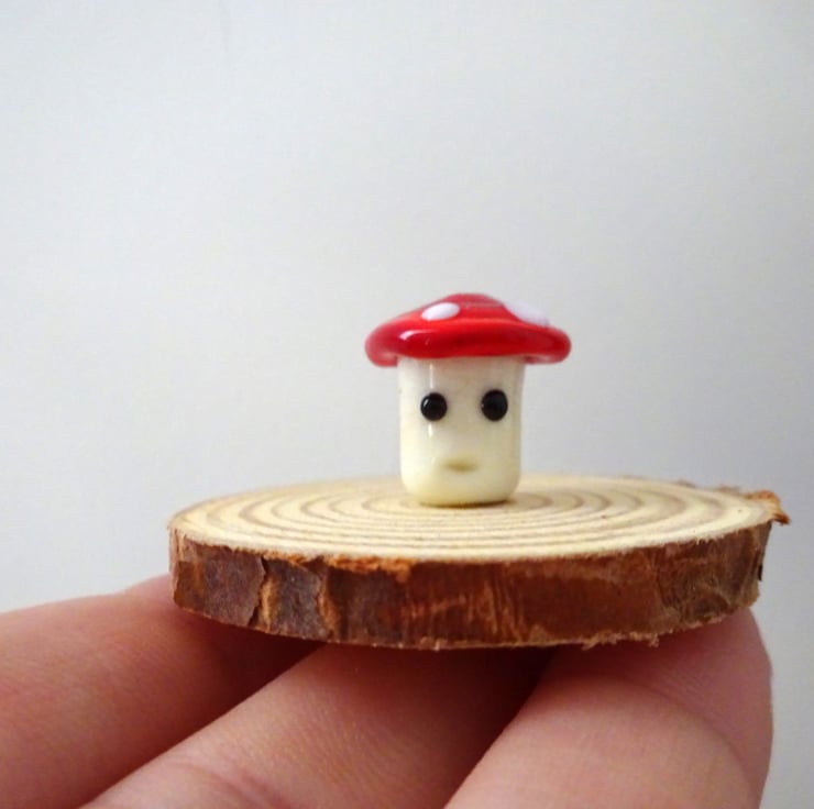A handmade gift which features a glass toadstool sat on top of a wood slice.