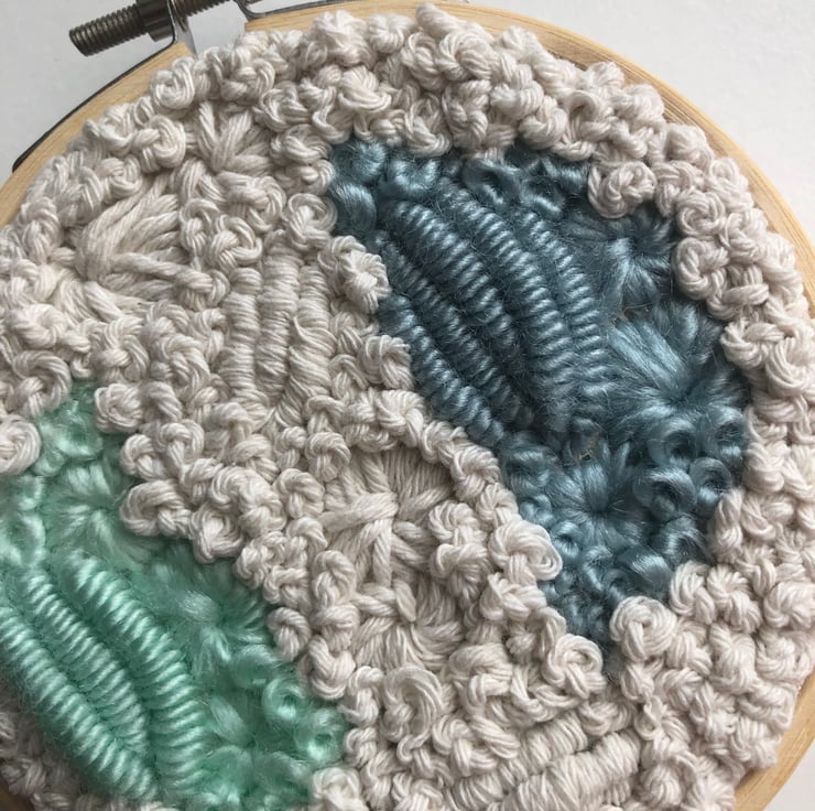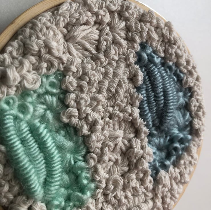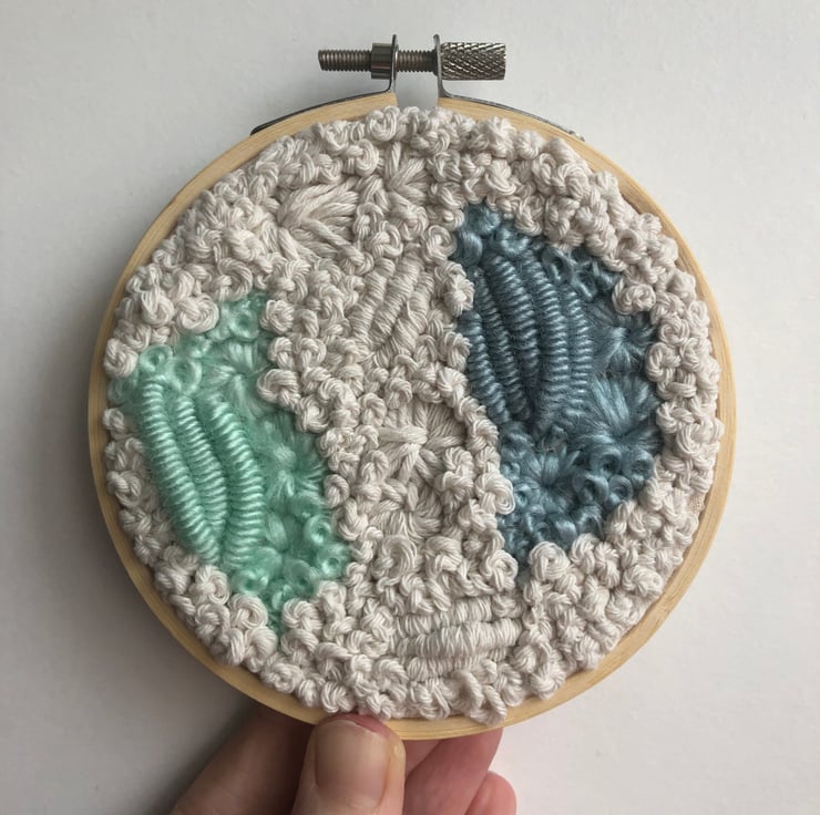 Sea shine a 4 inch one of a kind art piece. Embroidery thread and yarn have been hand stitched in an abstract pattern onto a cream fabric. This has created an art piece which is both eye catching and unique. A perfect addition to any home