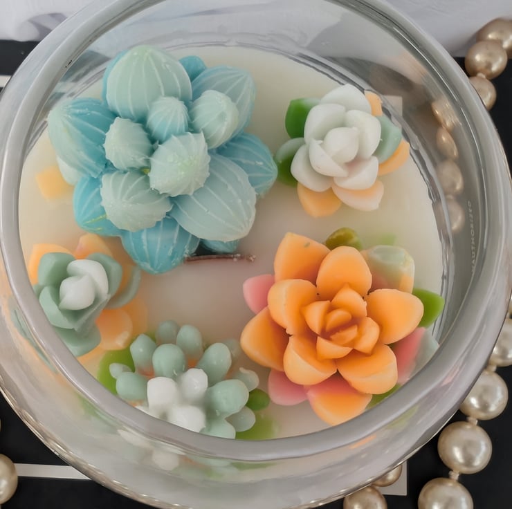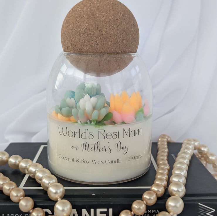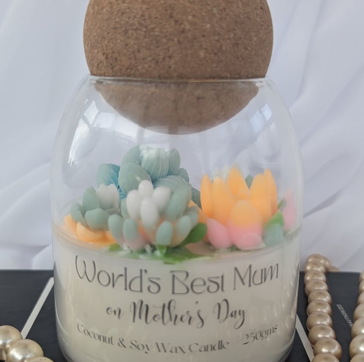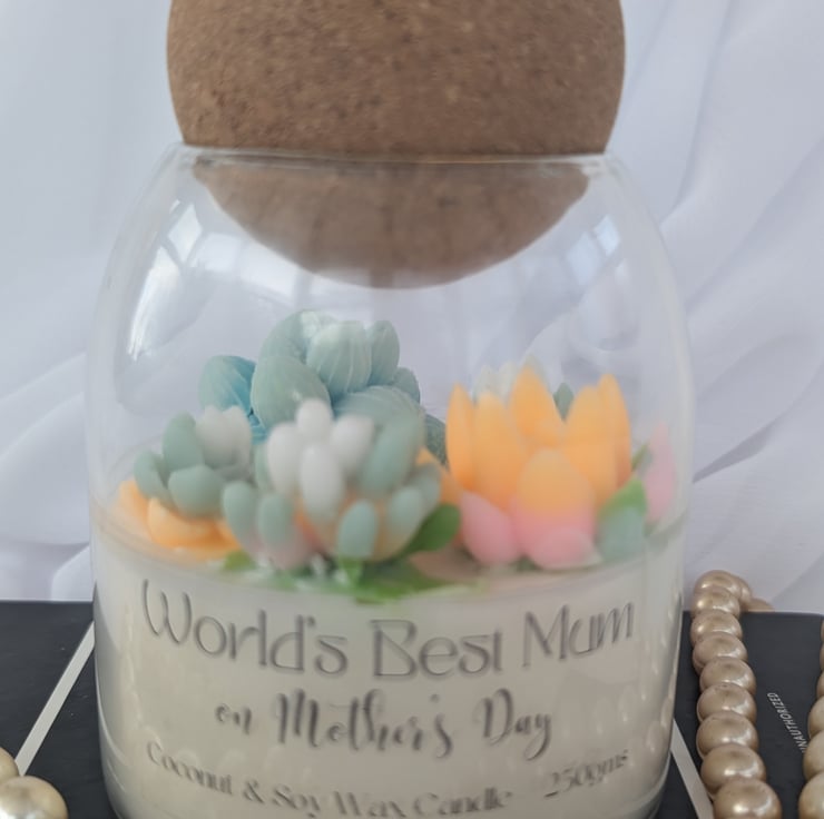 Celebrate your mum this Mother’s Day with an elegant candle presented in a reusable glass storage jar topped with a spherical cork lid. This candle is a one-of-a-kind creation, hand-decorated with stunning, hand-moulded succulent designs.