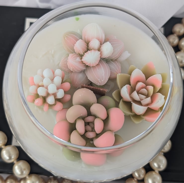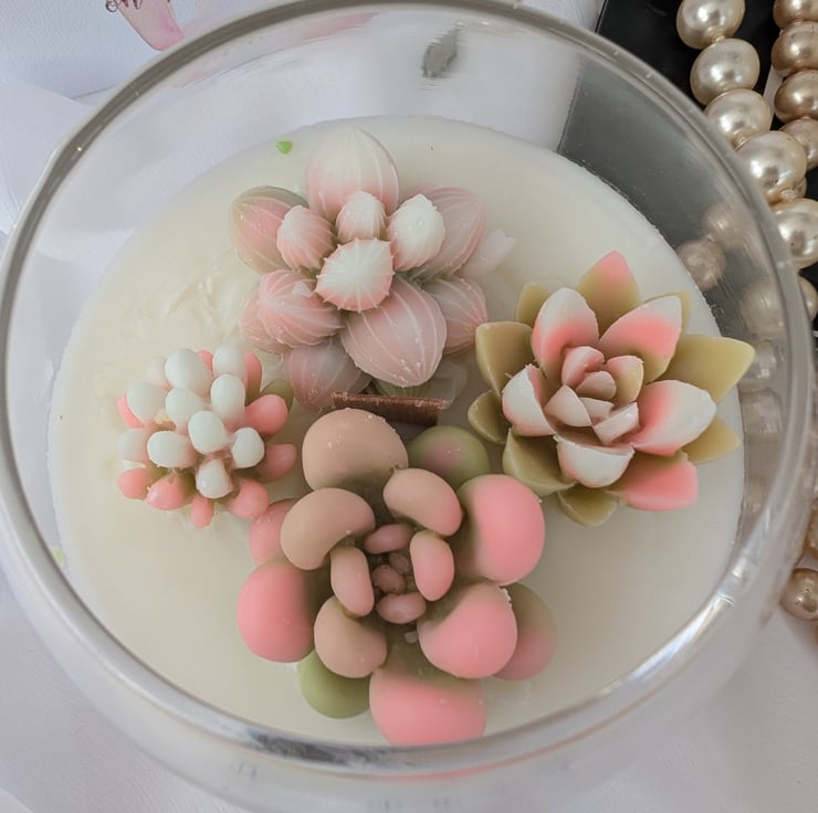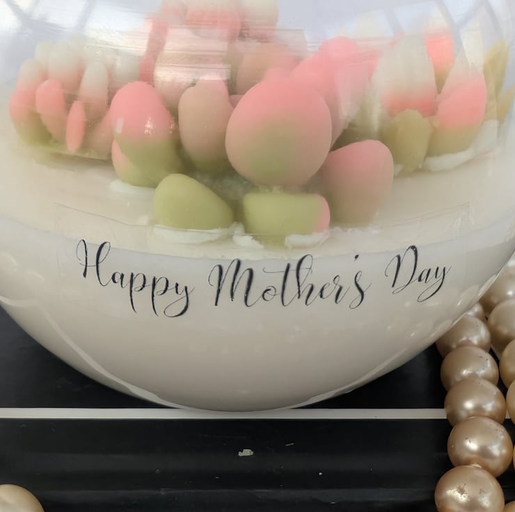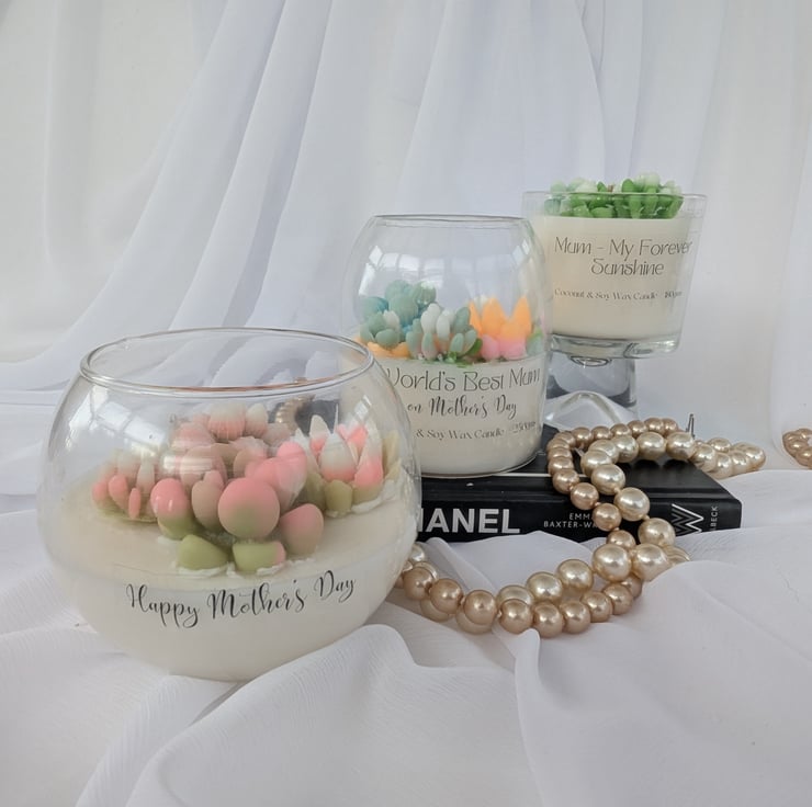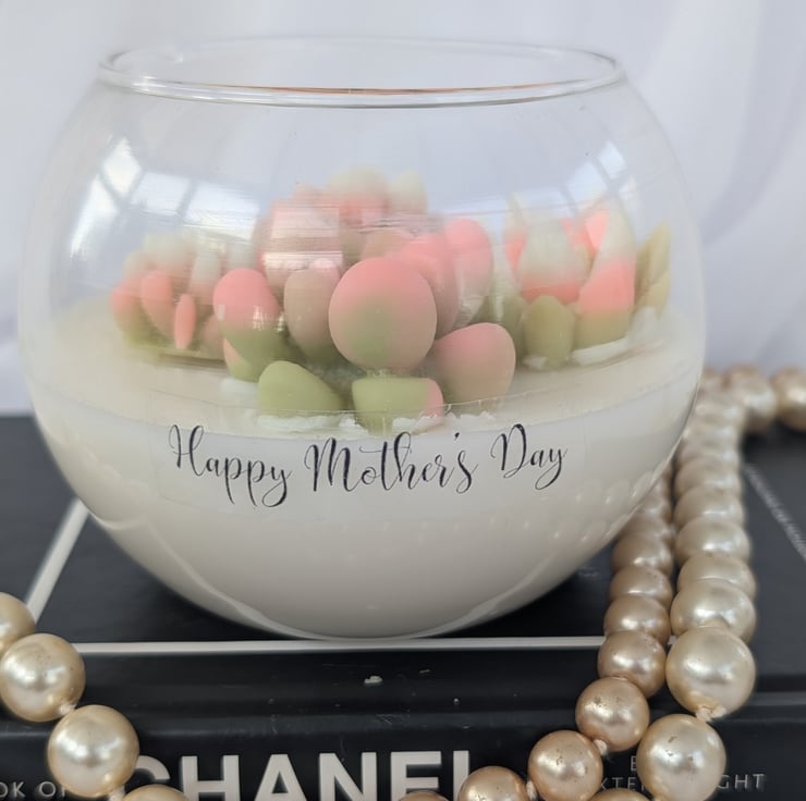 Treat your mum to a special gift this Mother’s Day with a handcrafted candle presented in a beautiful fish bowl-shaped glass. Each candle is a unique work of art, decorated with hand-moulded and coloured succulent designs. Made from a blend of coconut and soy wax, this candle is vegan, paraben-free, and cruelty-free, ensuring an eco-conscious burn.