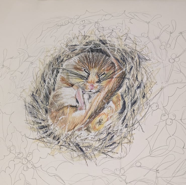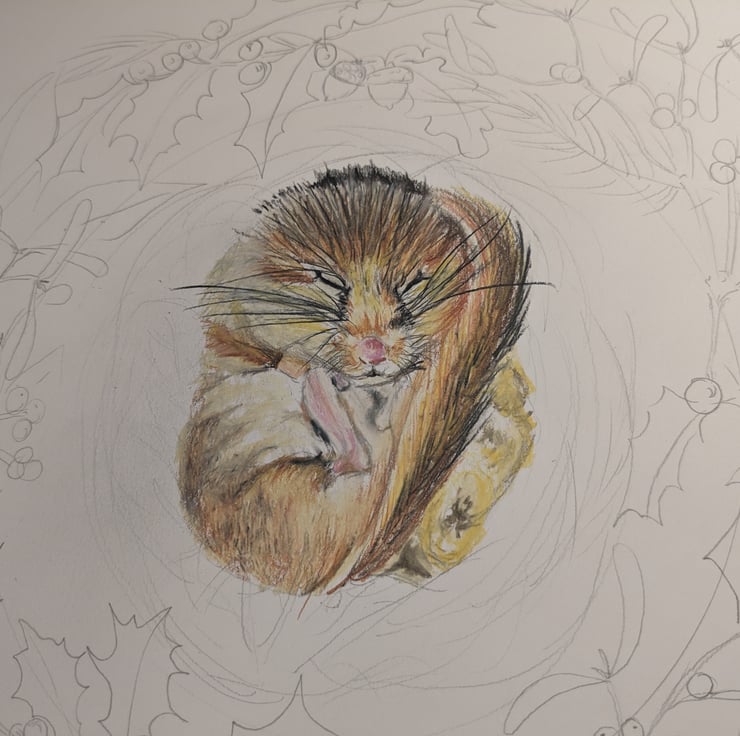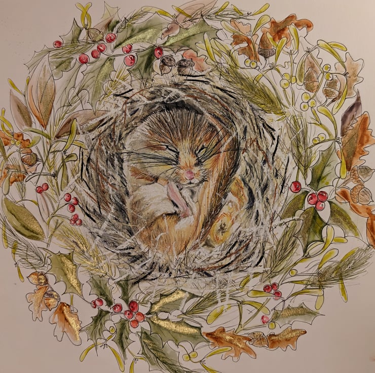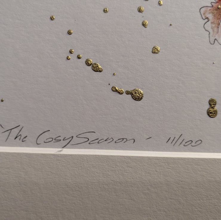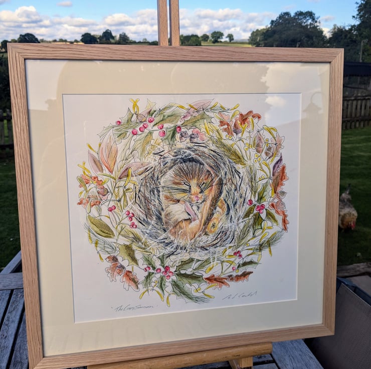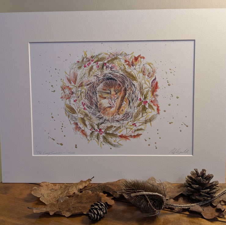 A limited edition, hand finished, signed high quality print of an original mixed media painting of a sleeping Dormouse. The original was painted with watercolour. I then used polychromos artists colouring pencil with drawing inks and finished with some ink and paint splashes. Every print is hand finished with gold ink, making no two the same. Each print is professionally mounted and cellophane wrapped.