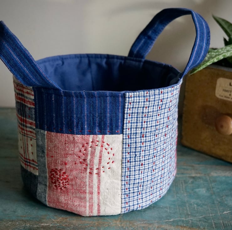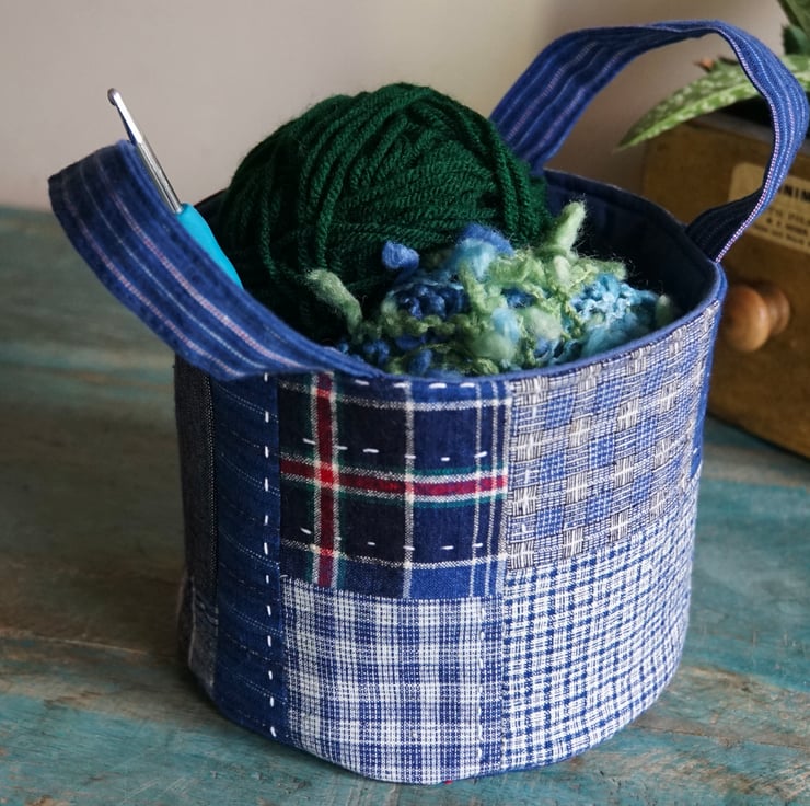 This handmade round fabric storage basket is the perfect solution for stylish and practical organization. Crafted from my choice of vintage fabrics, it's not only durable but also a lovely addition to any space. Whether you use it to store skincare essentials, craft supplies, or other small items, this basket is designed to keep your belongings tidy while adding a touch of handmade charm to your home. Every basket is fully lined, its soft structure allows for versatility, the handles make it easy to hold it up with one hand and its compact size makes it easy to place anywhere -- from shelves to countertops.