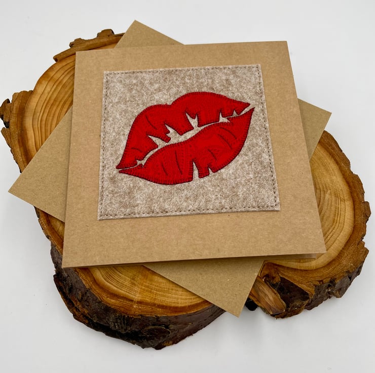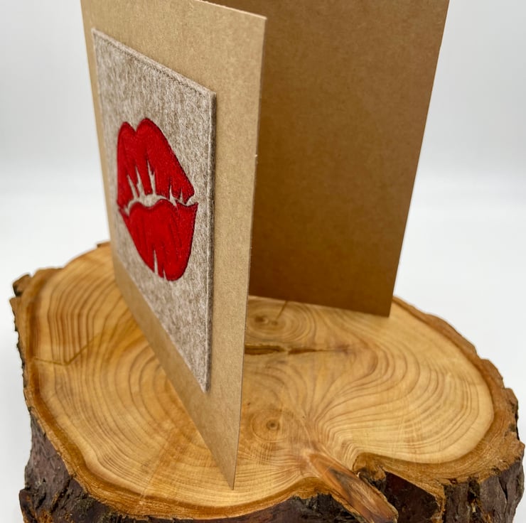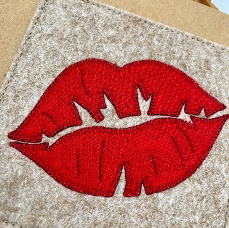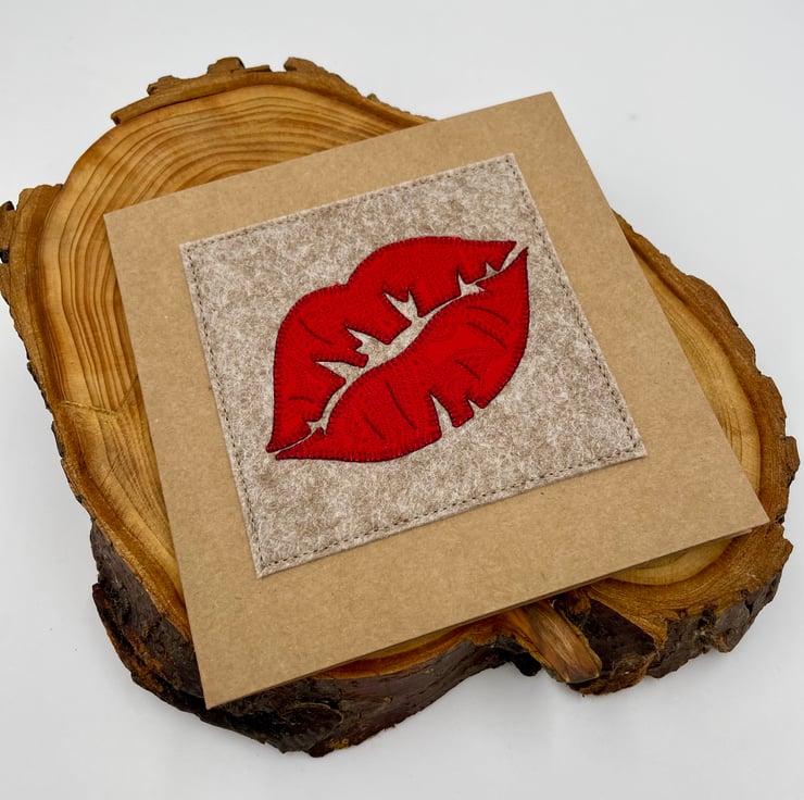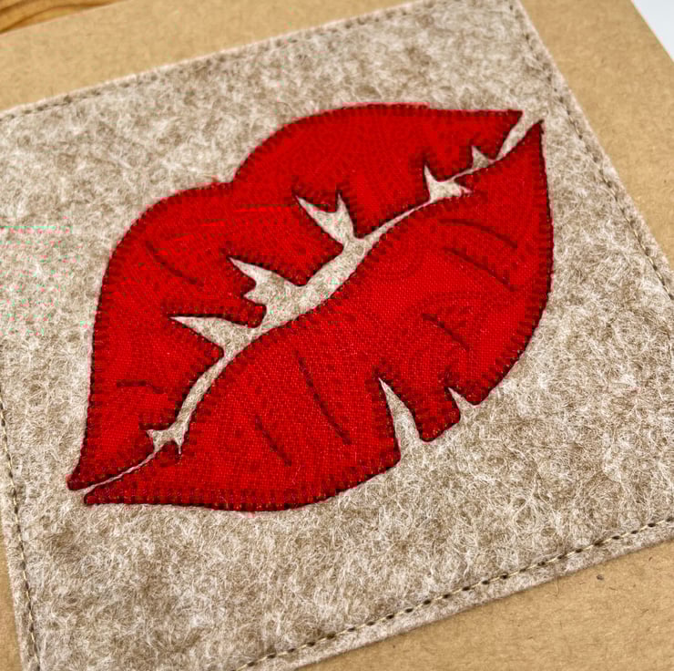 Add a little handmade charm to your Valentine’s Day! This one-of-a-kind card features appliqué red lips lovingly stitched onto soft beige felt, all set against a rustic recycled card. Blank inside, it’s ready for your heartfelt message and makes a perfect keepsake—frame it to treasure the moment forever. Simple, sweet, and sustainably crafted with love.