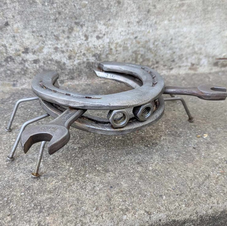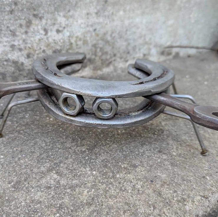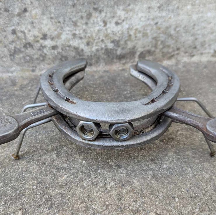 They are lovingly made from reclaimed horseshoes, spanners, nails and nuts in my workshop in Cornwall. They are left in bare metal & will get a rusty patina when left outside. Alternatively they are a blank canvas for you to paint in your choice of colour!