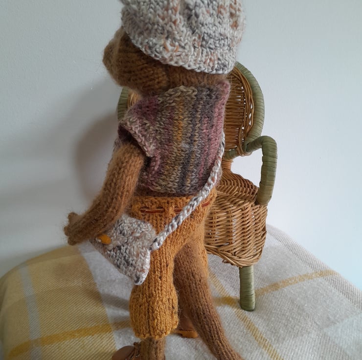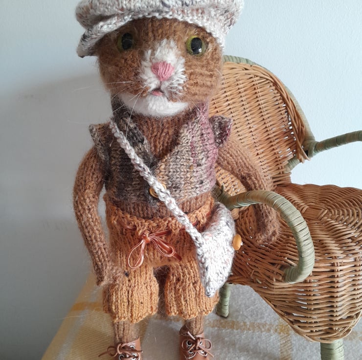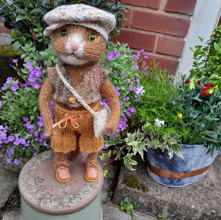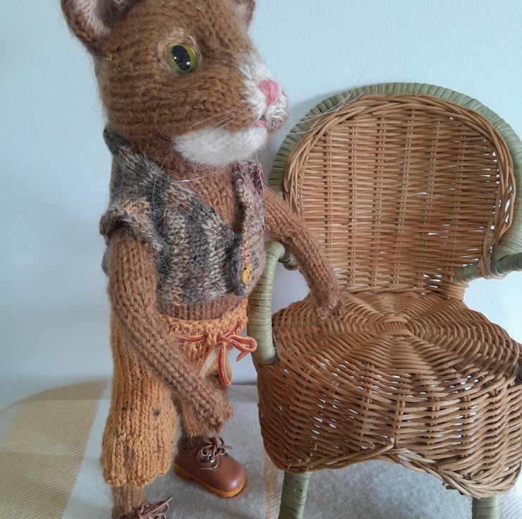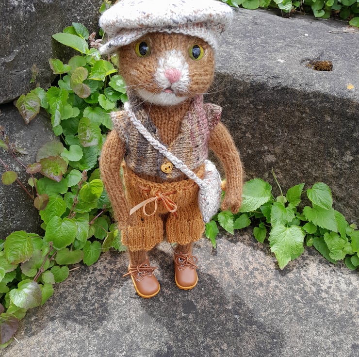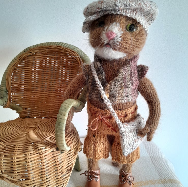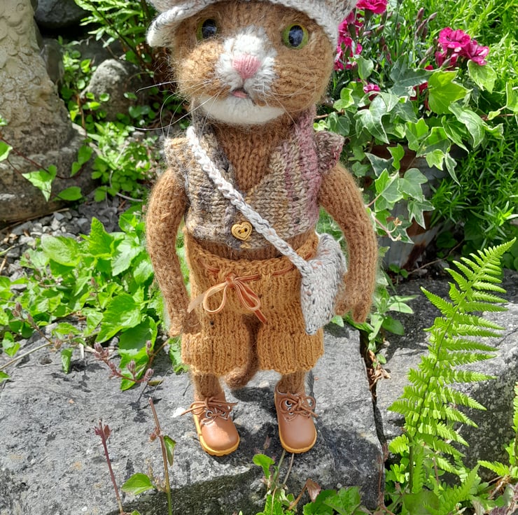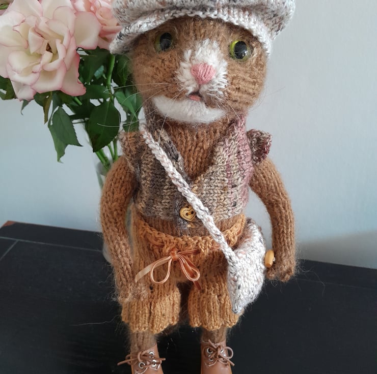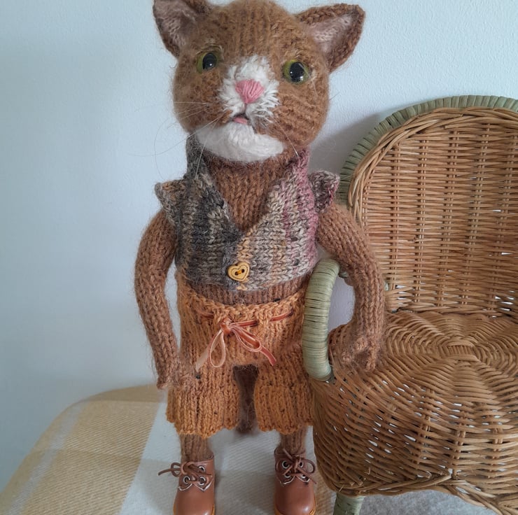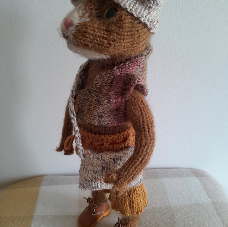 This pretty Cinnamon Abyssinian Cat measures 13" (33cm) from her laced shoes to the tip of her ears. Her pussycat body is knitted an alpaca and mohair yarn in a rich spice colour to resemble the gorgeous rich brown of the Abyssinian breed of felines. Her clothes are in a similar yarn with her toggled jacket edged in faux fur. No cat girl can venture into town without her handbag.