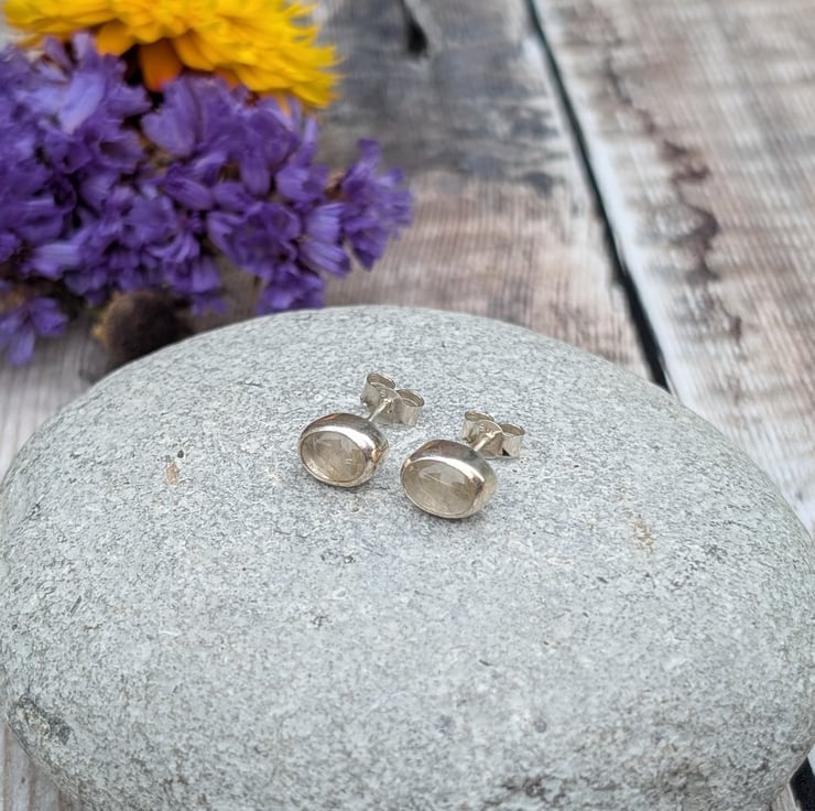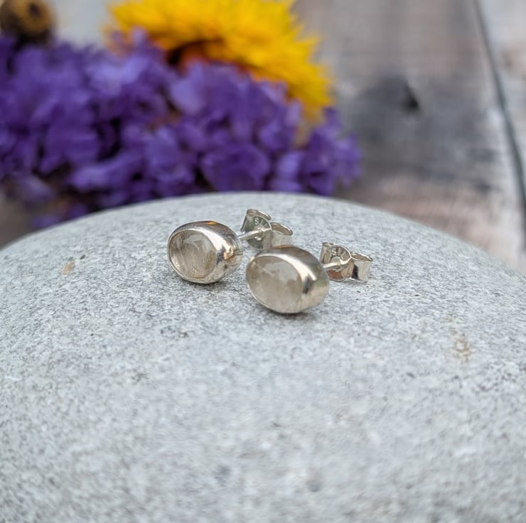 These handmade stud earrings feature striking oval-shaped rutile quartz stones, each showcasing delicate golden inclusions that shimmer subtly in the light. The stones are set in recycled sterling silver, creating a simple yet timeless design that highlights the natural beauty of the quartz.