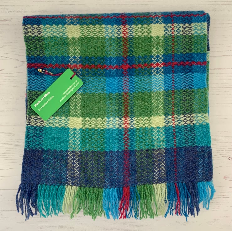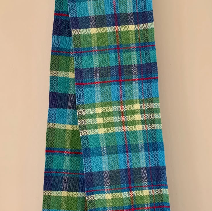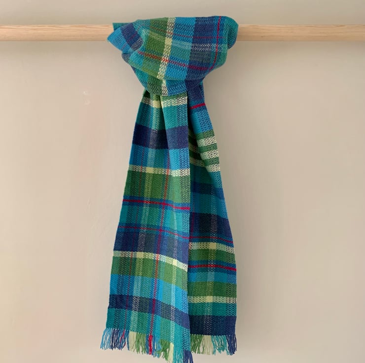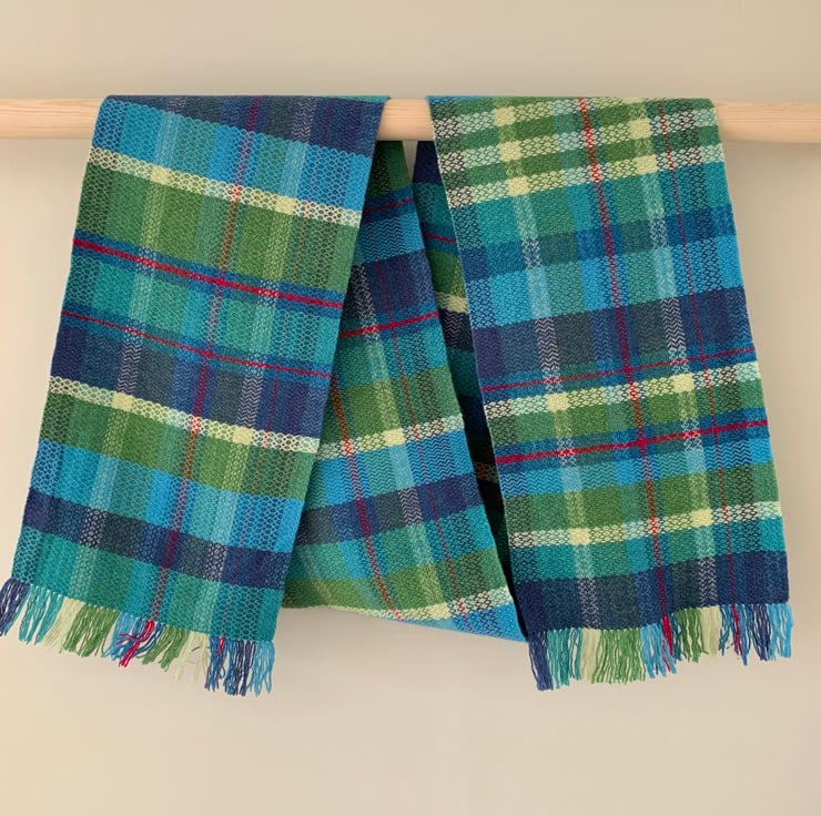 A beautiful handwoven scarf in shades of blue, green and turquoise, with a deep cranberry highlight throughout. Woven using two twill designs in soft merino lambswool.