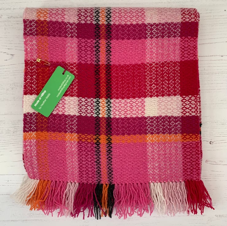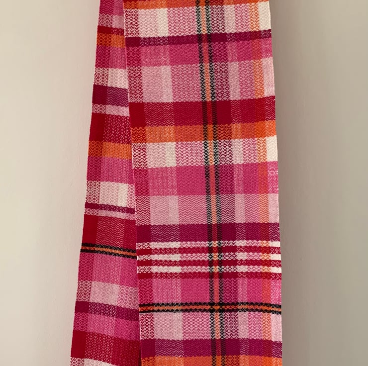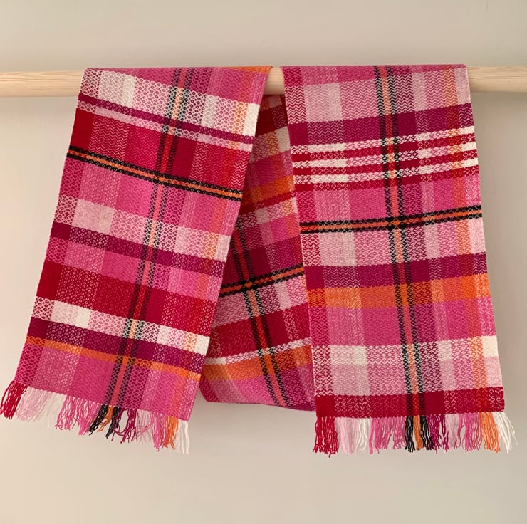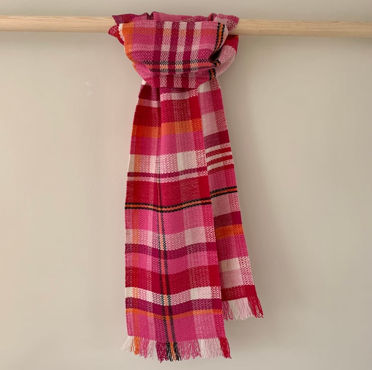 A beautiful handwoven scarf in shades of pink, cream, ruby red and orange, with charcoal grey highlights. Woven using two twill designs in soft merino lambswool.