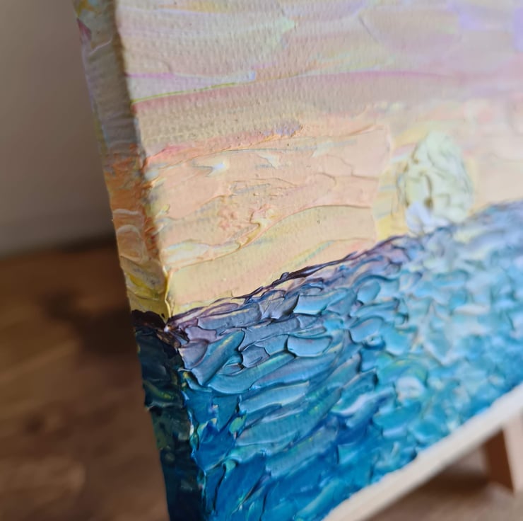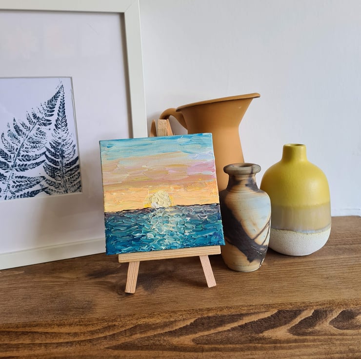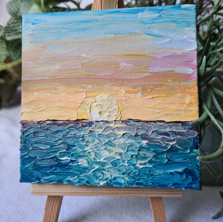 This 10x10cm original canvas art is of a colourful seascape sunset and has been painted with acrylics including the sides of the canvas. It has lovely colour and texture in the sea and sun, and blended colour in the sky. This mini canvas would add a beautiful splash of colour to a shelf or mantel display or a gallery wall. A little easel is provided to display the painting, or you could hang it on the wall using Command strips or your own fixings.