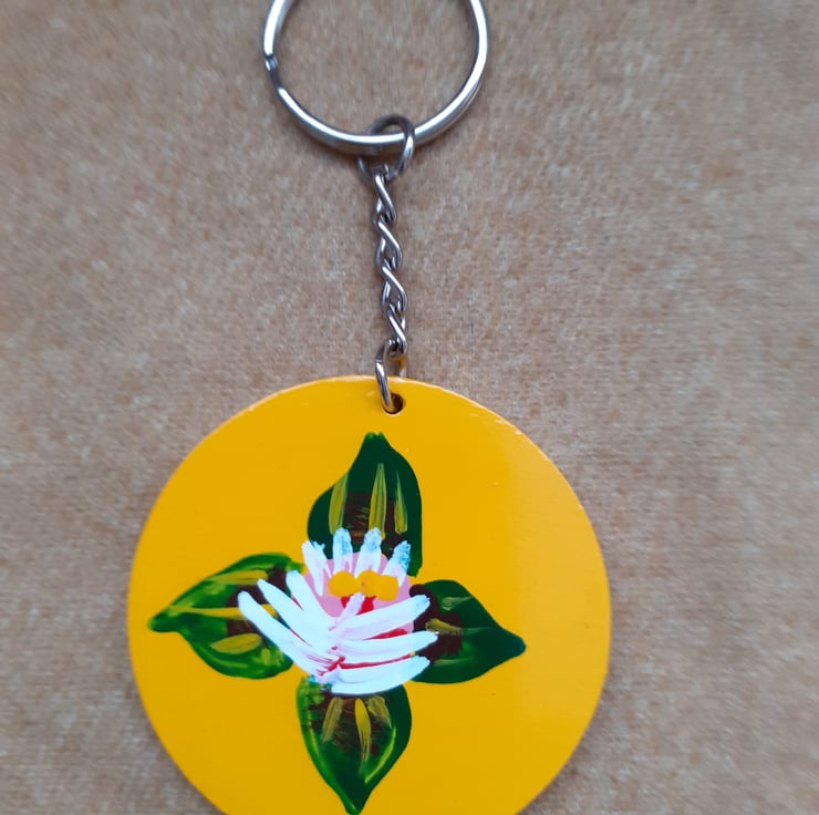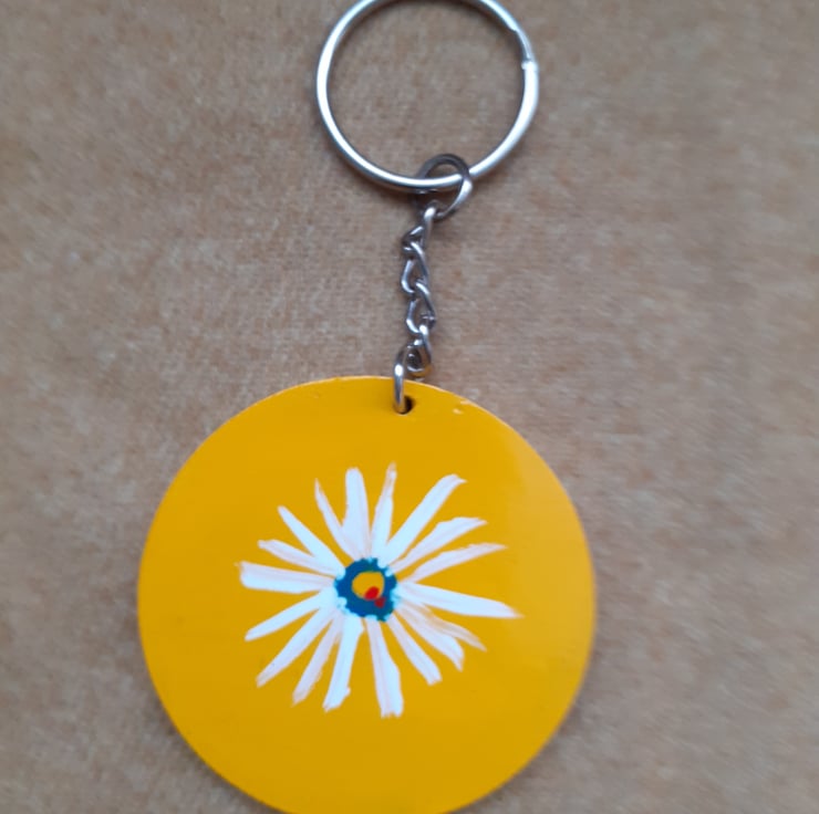 A circular wooden keyring painted yellow. It has a white canal art style rose on one side and a daisy on the other.