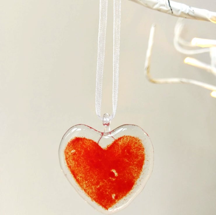 These fused glass heart decorations have been handmade by me in my studio in the Wye Valley.