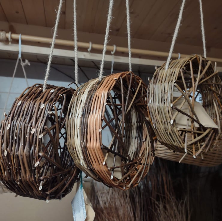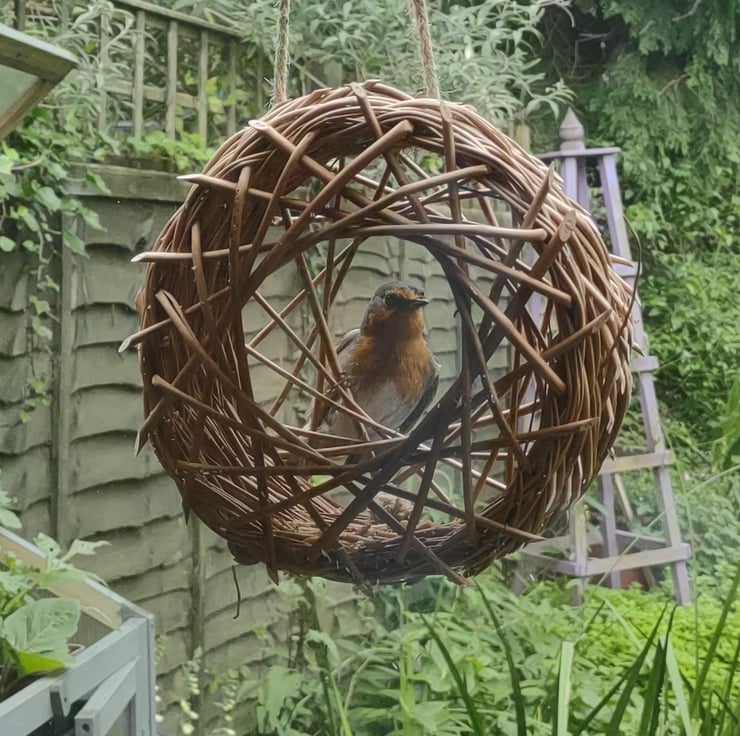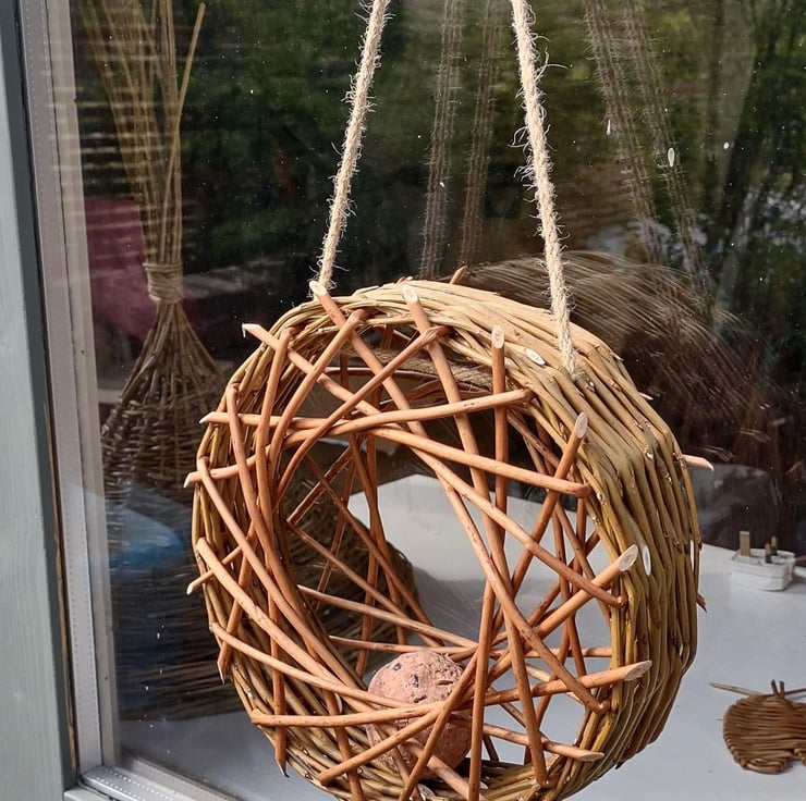 The bird feeder is 20cm in diameter and is the brown version with bark on, woven with a willow variety called Salix Black Maul.