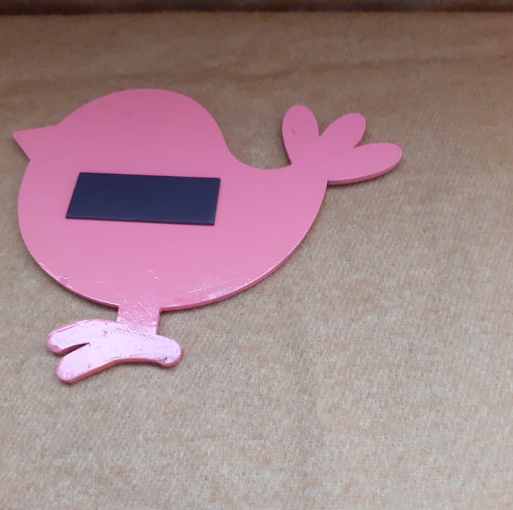 A wooden bird shaped fridge magnet painted pink. It has a red canal art style rose on the front.