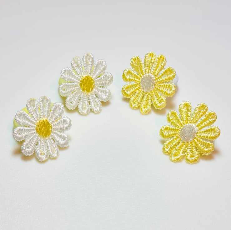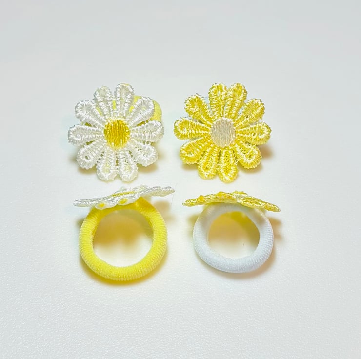 Handmade White and Lemon Yellow cotton sewn daisy flowers, set on white and Yellow mini bands for a soft comfortable hold.