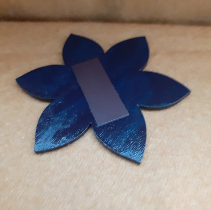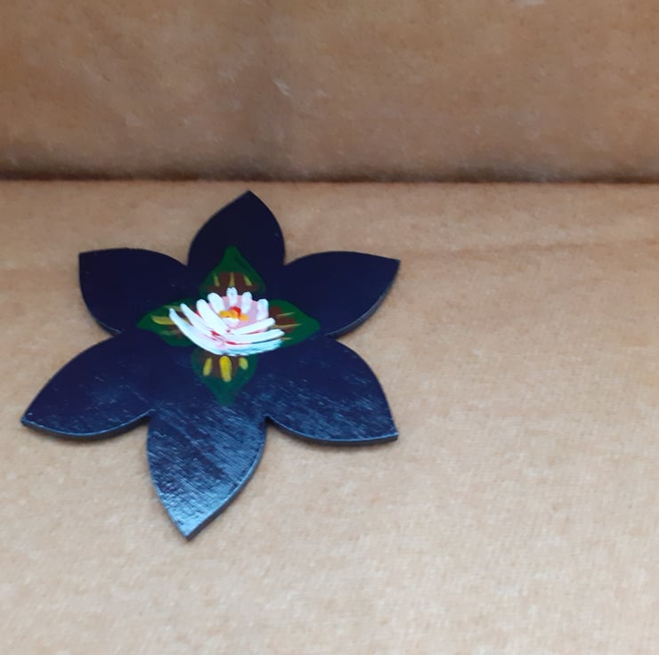A wooden flower shaped magnet painted dark blue. It has a white canal art style rose painted on.