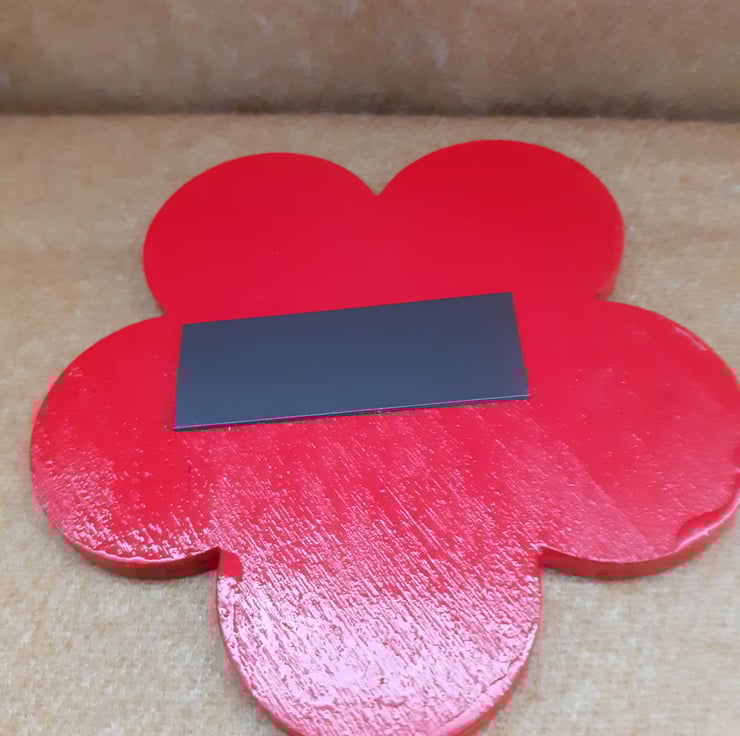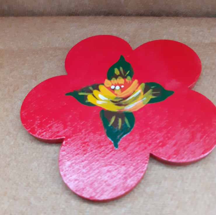 A wooden flower shaped magnet that has been painted red. It has a yellow canal art style rose painted on it.