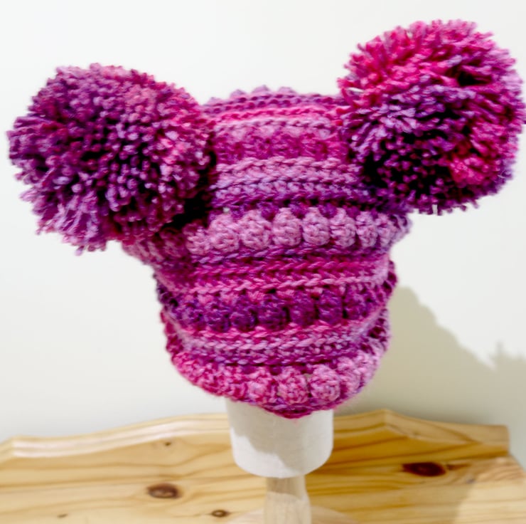 Double pom pom hand crochet hat. Made from soft chunky acrylic yarn in a mix of pinks and rose that's ideal for vegans which is machine washable to 30 degrees.