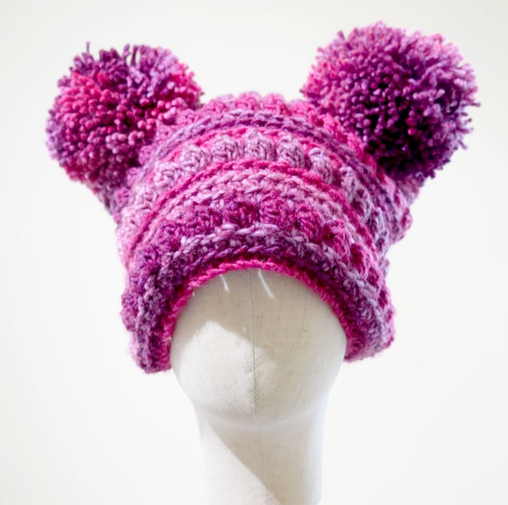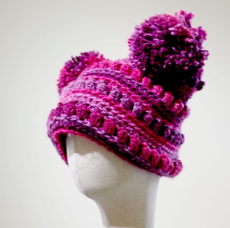 Double pom pom hand crochet hat. Made from soft chunky acrylic yarn in a mix of pinks and rose that's ideal for vegans which is machine washable to 30 degrees.