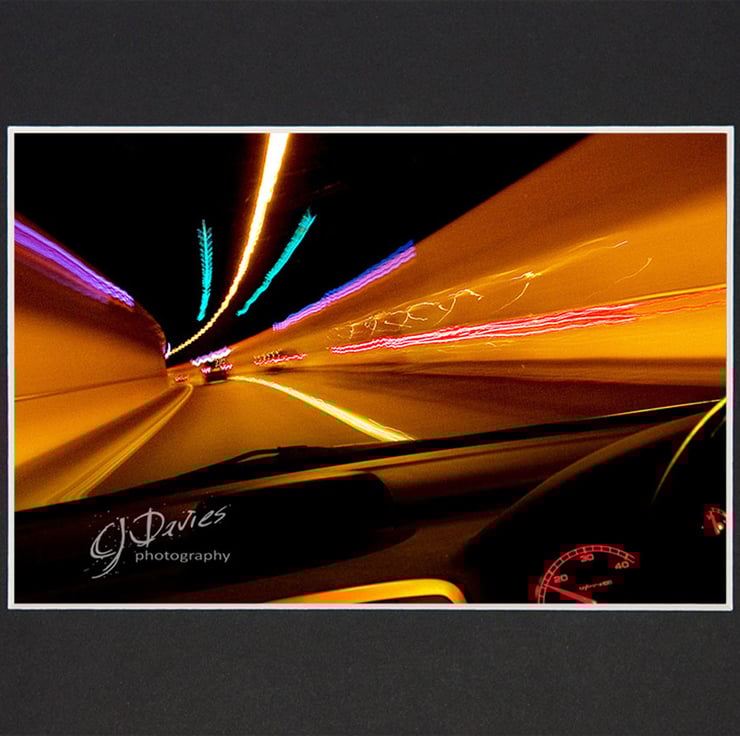 A long exposure of travelling through the Hindhead Tunnel on the A3, Surrey.