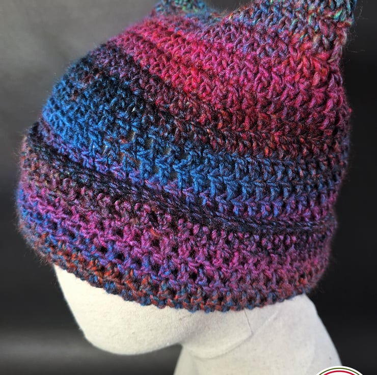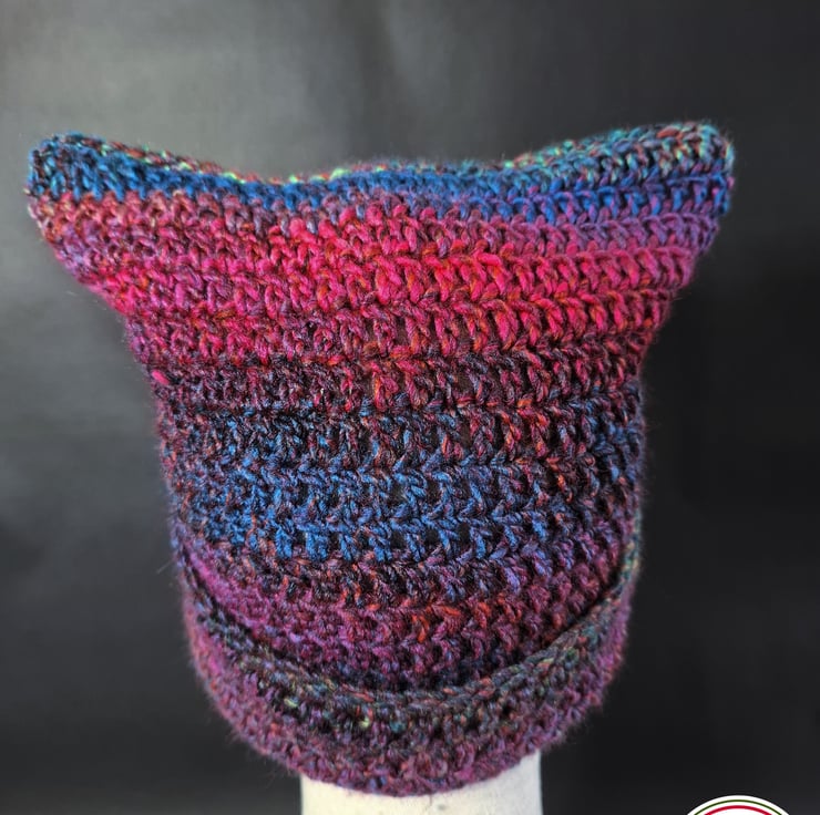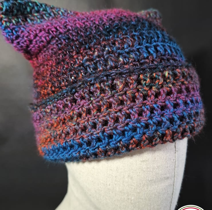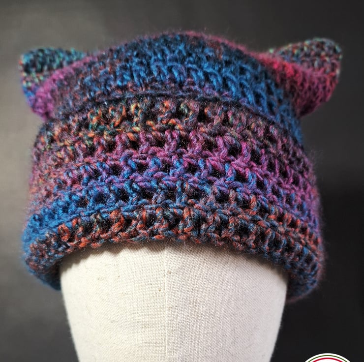 I crocheted this cute hat using a gorgeous, soft acrylic yarn. The design of the hat is a basic square shape, so when the hat is worn it creates little “cat ears” on the top corners.