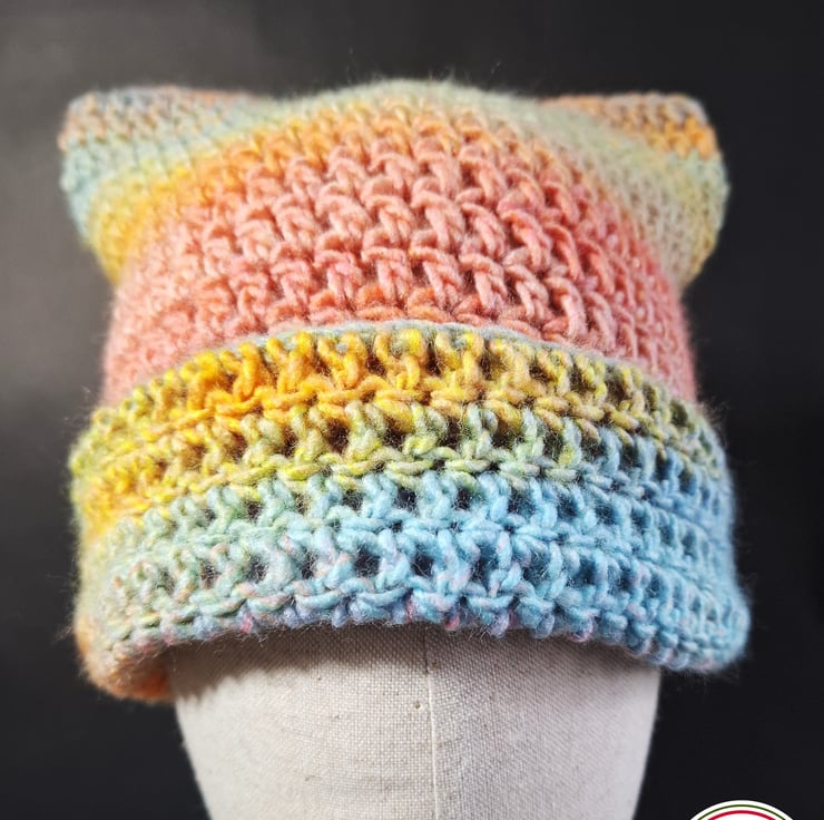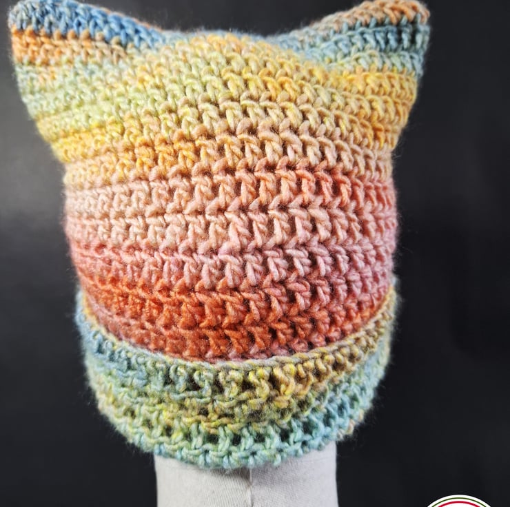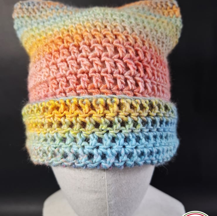 I crocheted this cute hat using a gorgeous, soft acrylic yarn. The design of the hat is a basic square shape, so when the hat is worn it creates little “cat ears” on the top corners.