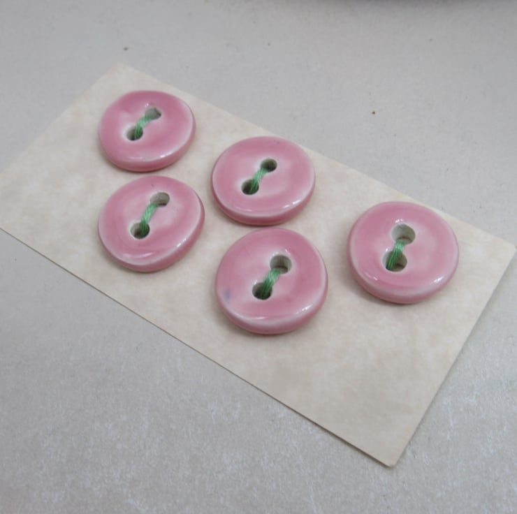5 small stoneware buttons finished with a smooth shell pink glaze