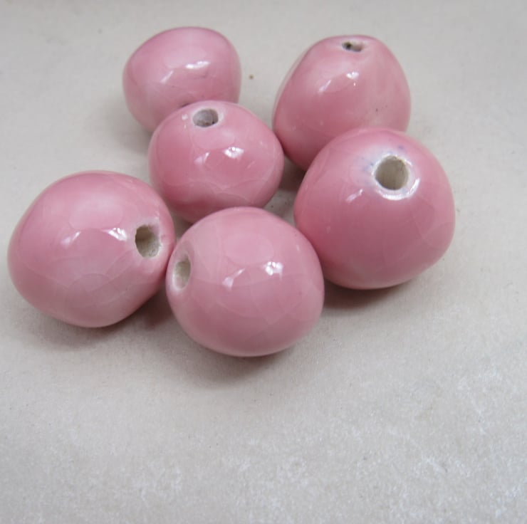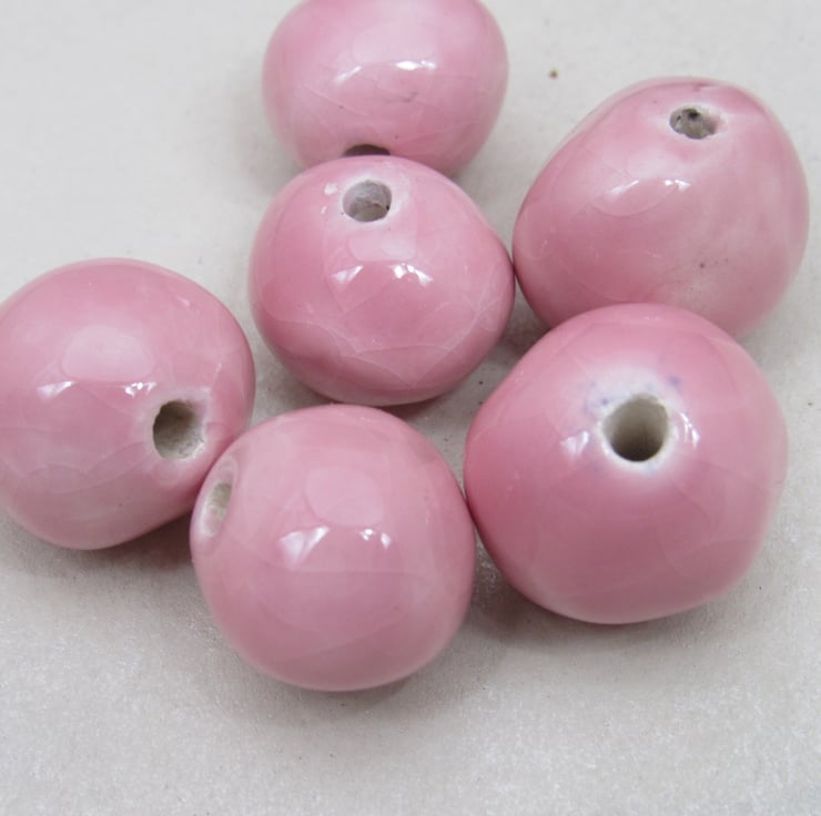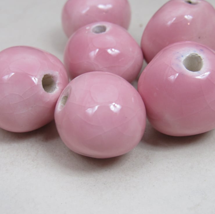 A mixture of handrolled ceramic beads, finished with a soft shell pink glaze.