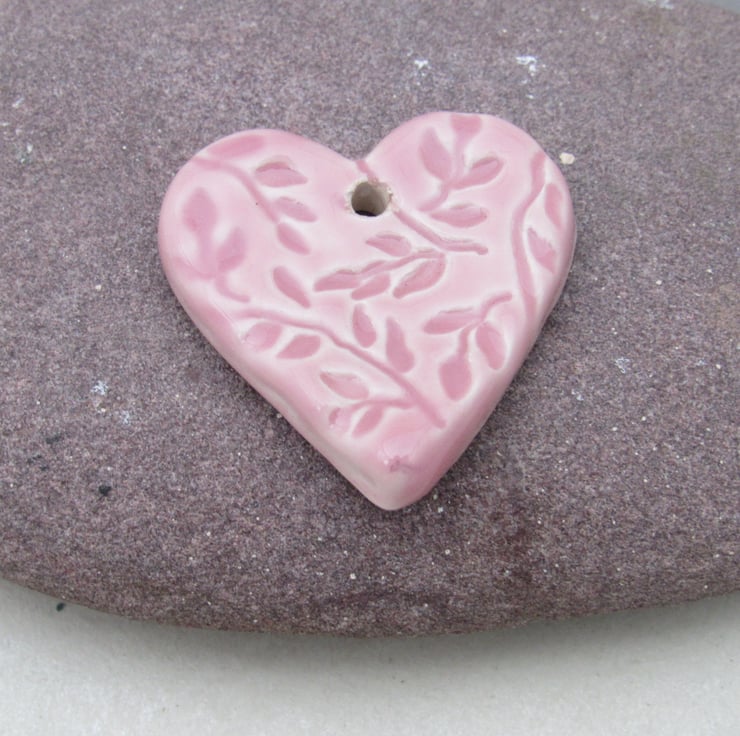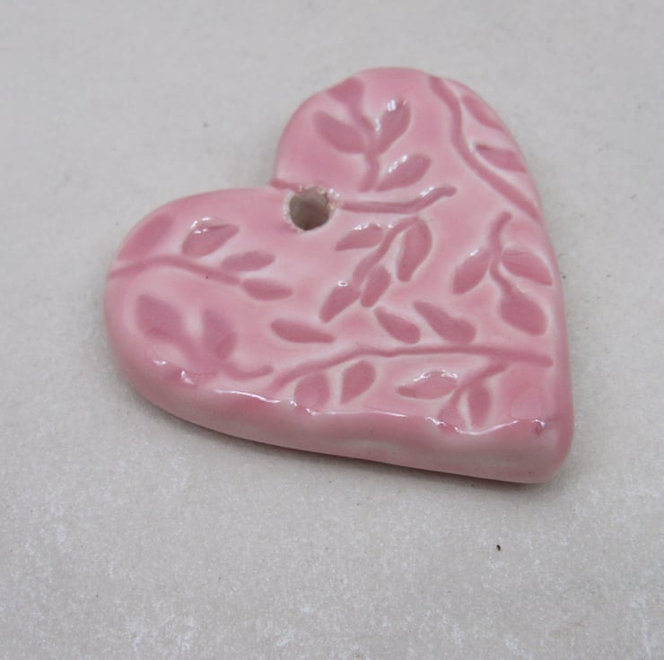 Medium heart shaped stoneware pendant, textured with a delicate leaf motif.