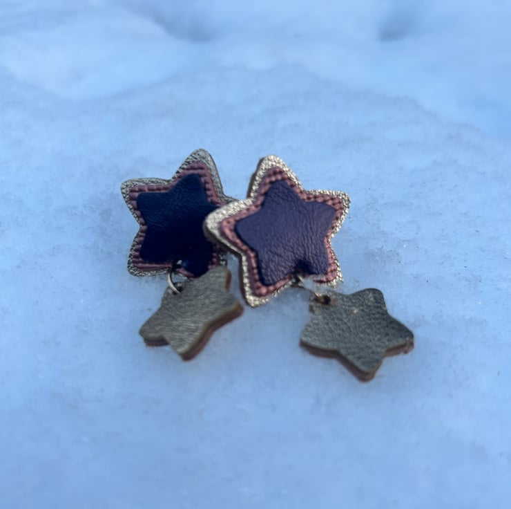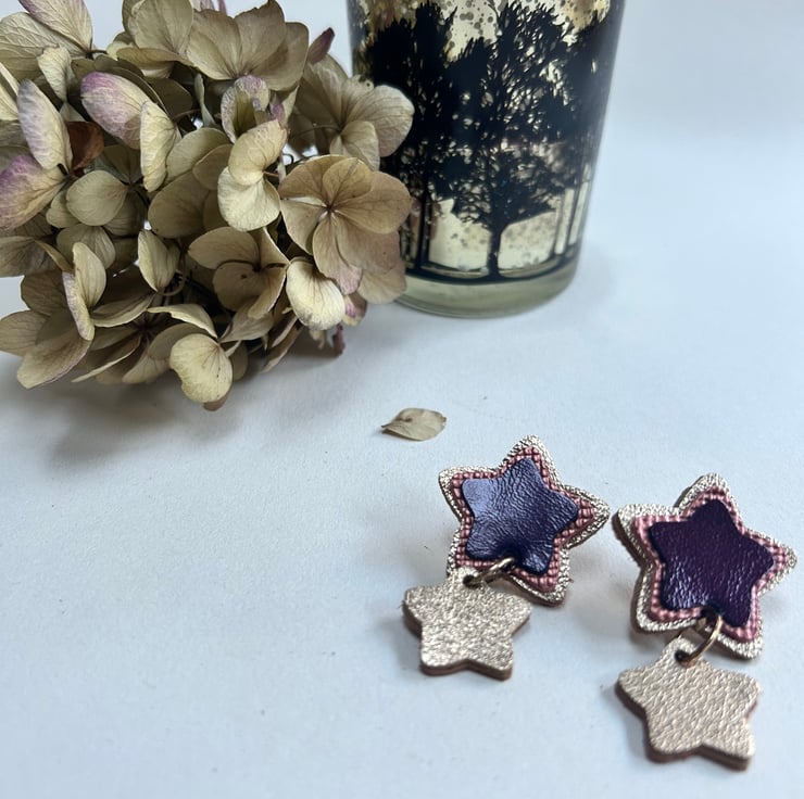 Star drop metallic leather earrings. The stars are made from layering different colours and sizes of gold, rose gold and purple metallic leathers together to make a 3 dimensional shape.