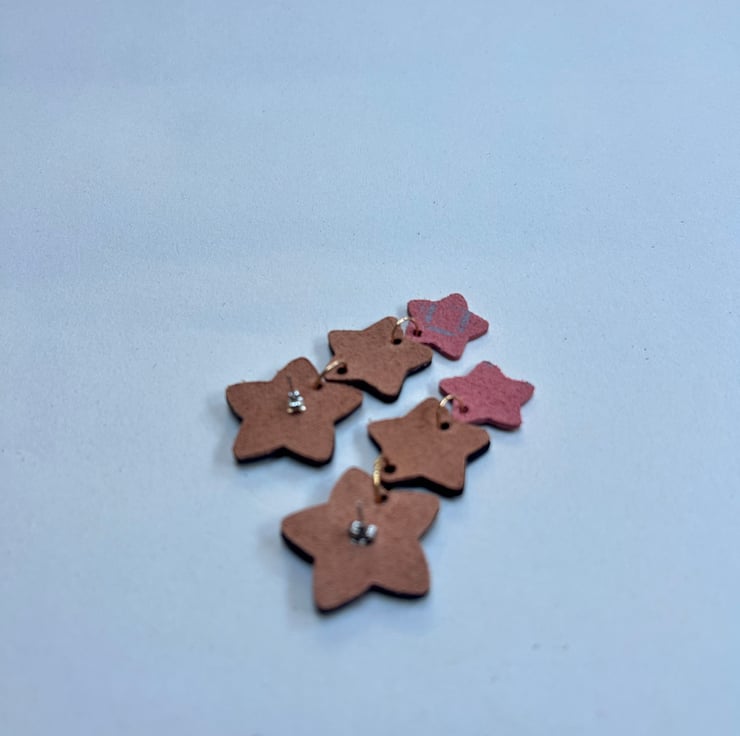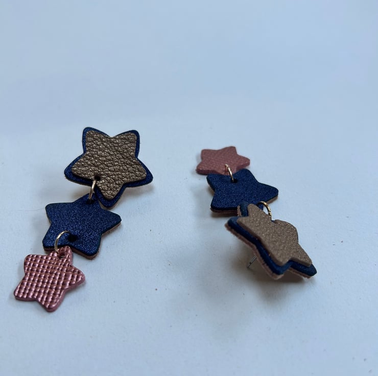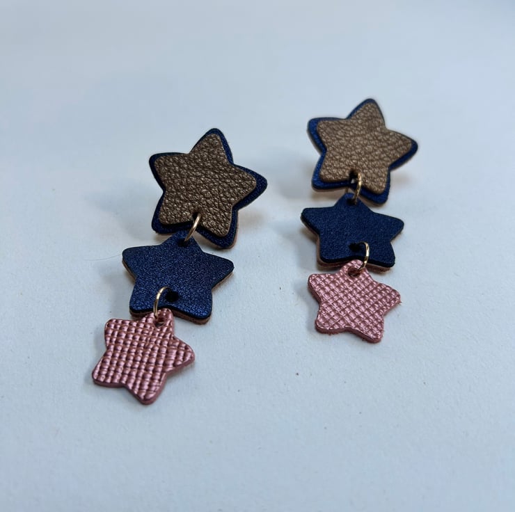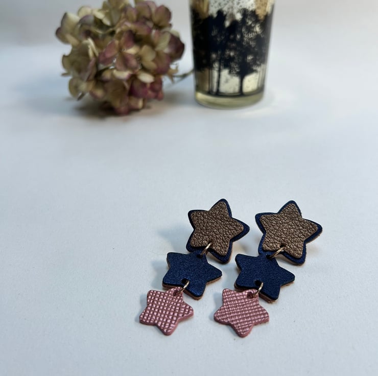 Star statement leather drop earrings are made from layering different colours and sizes of navy blue, bronze and rose gold metallic leathers together to make a 3 dimensional shape. The post is a silver colour and is hypoallergenic so is kind to the skin and feather light so can be worn all day.