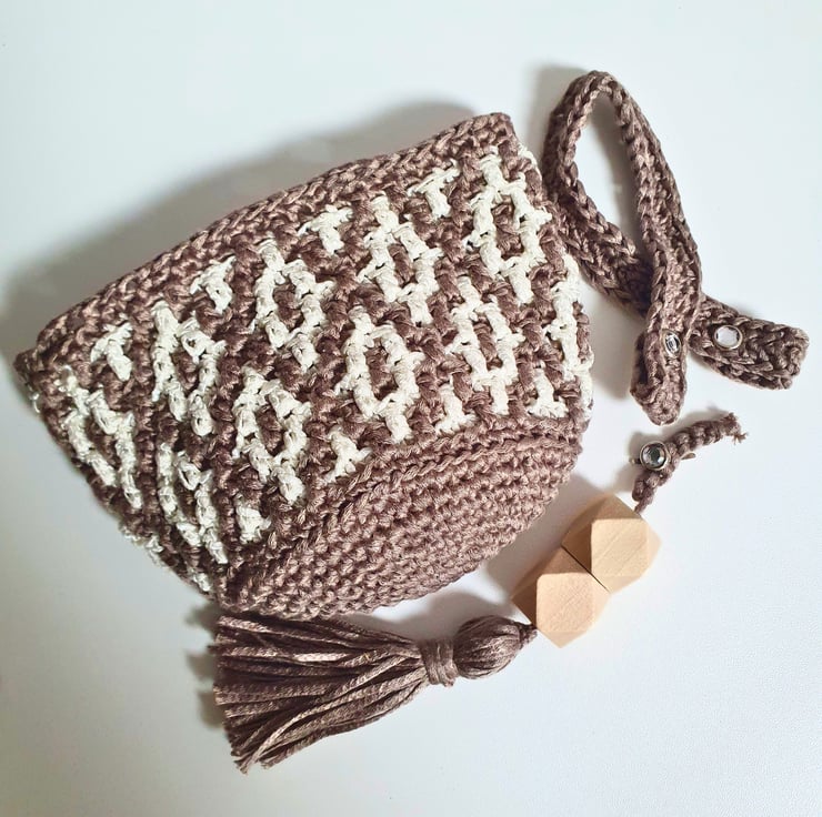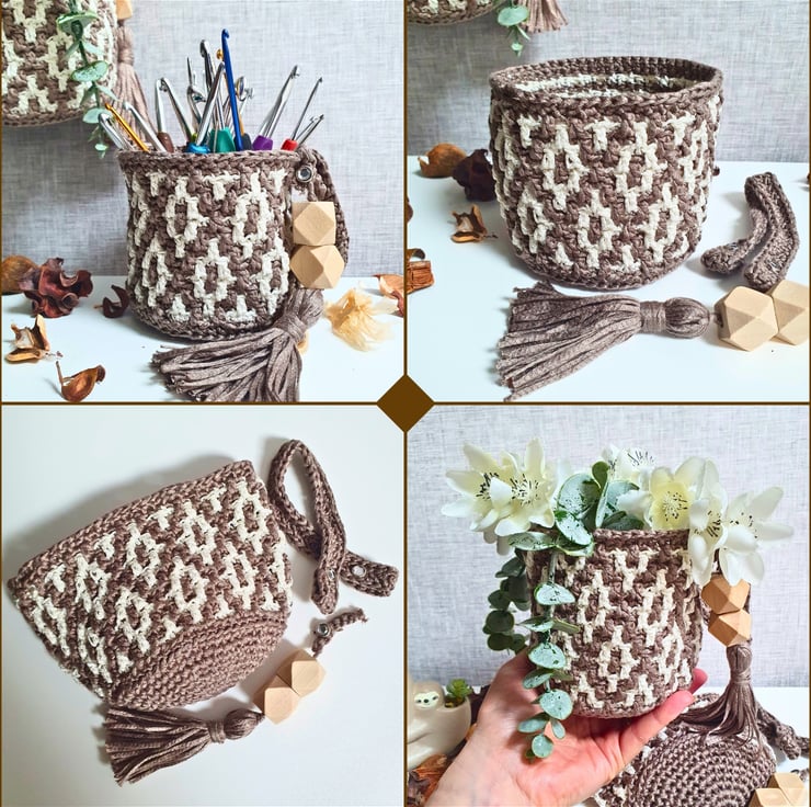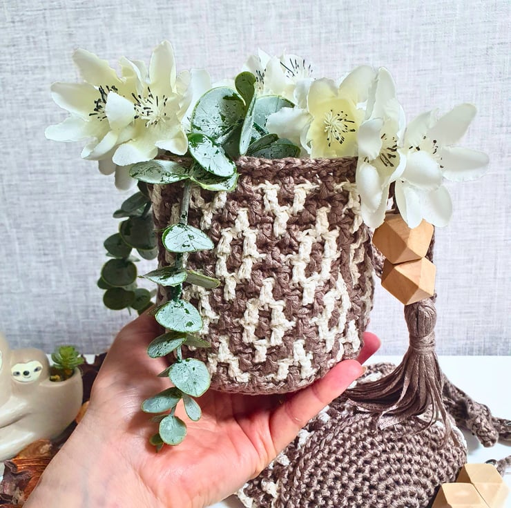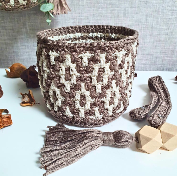 Set of two hanging baskets in Brown & White, handmade with the mosaic crochet technique. Perfect for hanging on your wall and fill with artificial flowers, air plants & small flower pots, on your peg board filled with your craft tools and various bits & bobs, or just place them on your furniture & decorative shelf & use them to store all your small items. A practical & modern idea for your interior decor, or as a housewarming gift.