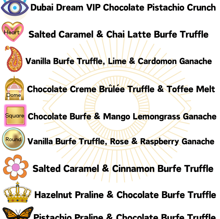 Made from the finest quality luxary Ingredients - Belgium Chocolate and a Desi Creamy Burfe which has the taste and texture similar to Luxary Vanilla base Truffle, sometimes flavoured lightly and delicately to make each Burfe unique, decorated in Cocao Butter and sometimes a few sugar ball sprinkles for decoration and a pretty sight for the eyes. Colouful and Pretty, Classy, Contemporary and Delicious Melt in the mouth leaving marvellous taste your tastebuds will remember as heavenly and divine. Unique Designs are created weekly so your box may vary slightly from the image in the picture.