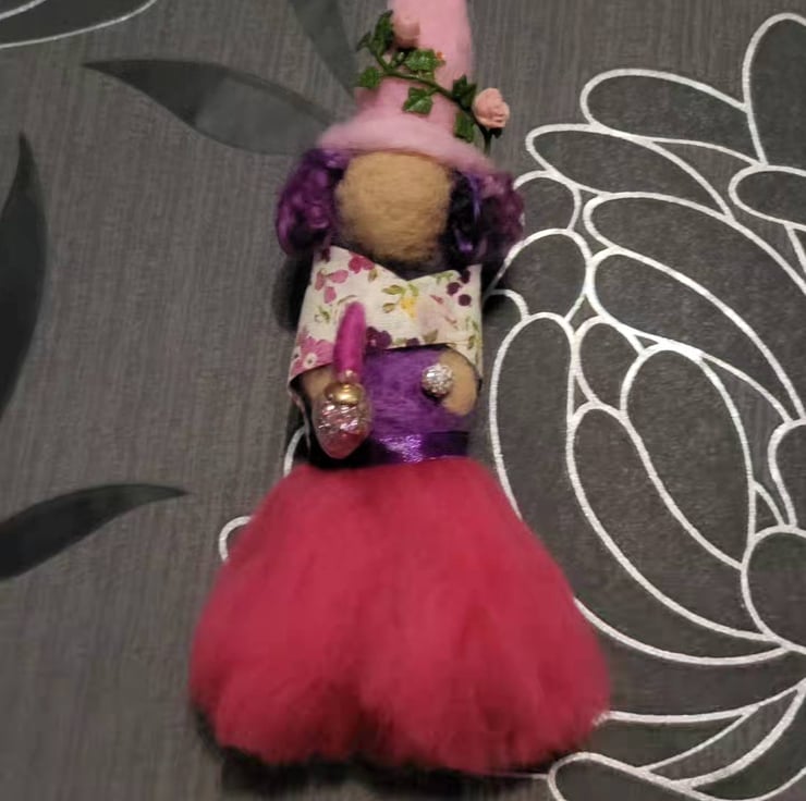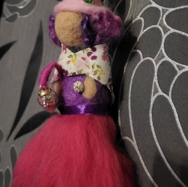She has purple, curly hair, a floral patterned, cotton shawl and a big, fluffy pink skirt.
