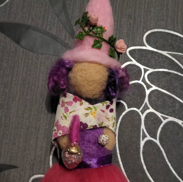 Meet Magical Maggie, the Good Witch. With pretty pink tones she is wearing a light pink, witches has, decorated with little roses.